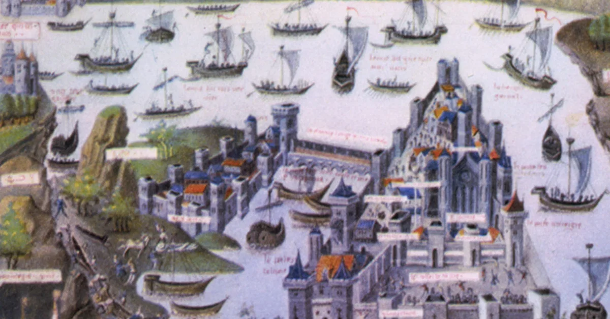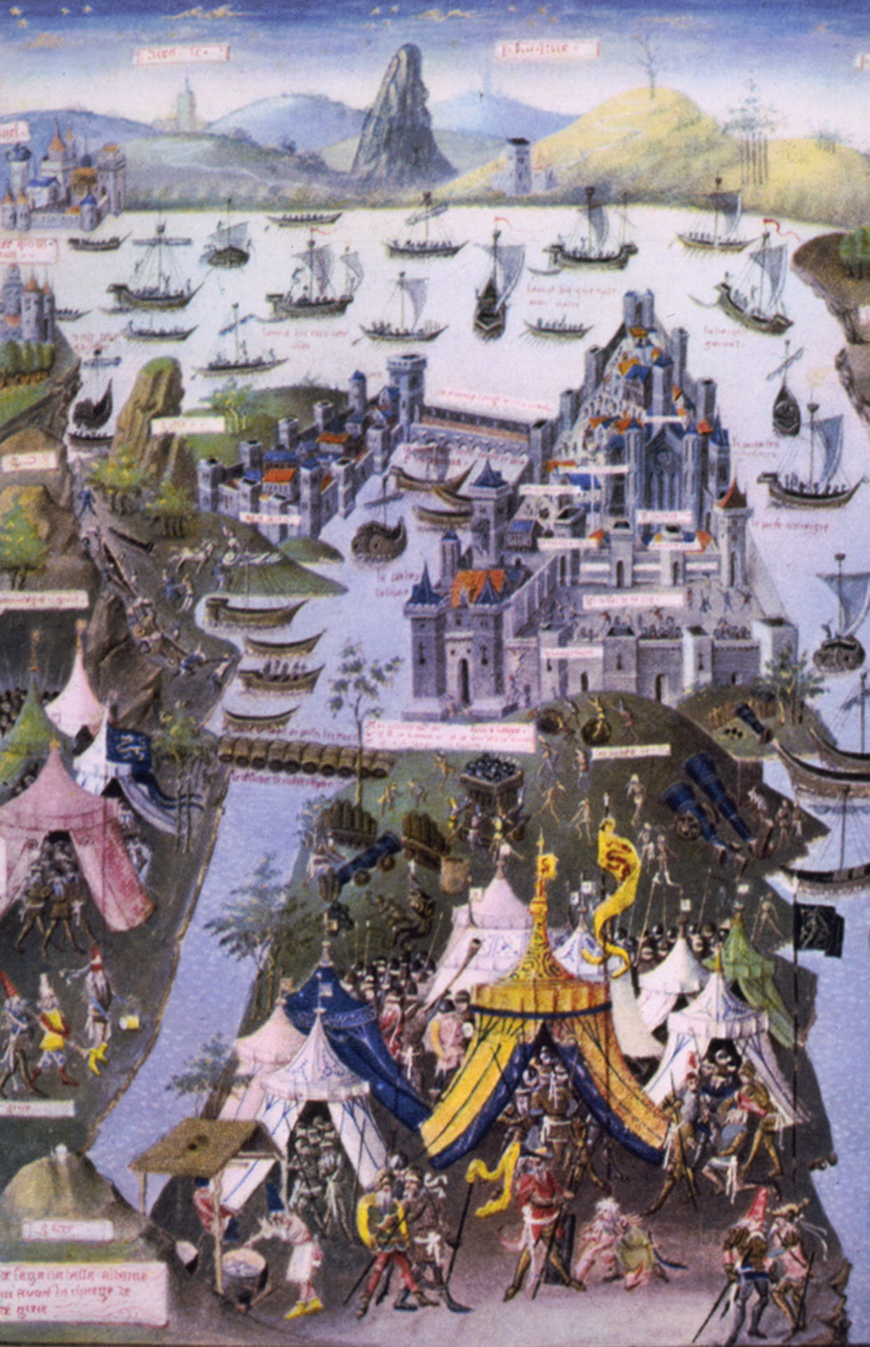 The Siege of Constantinople, 1453. Illustration by Jean Le Tavernier accompanying a translation by Jean Miélot of Bertrandon de la Broquière's Voyage d'Outre-Mer. Full-page miniature, MSS fr. 9087, at folio 207 vv., created after 1455.