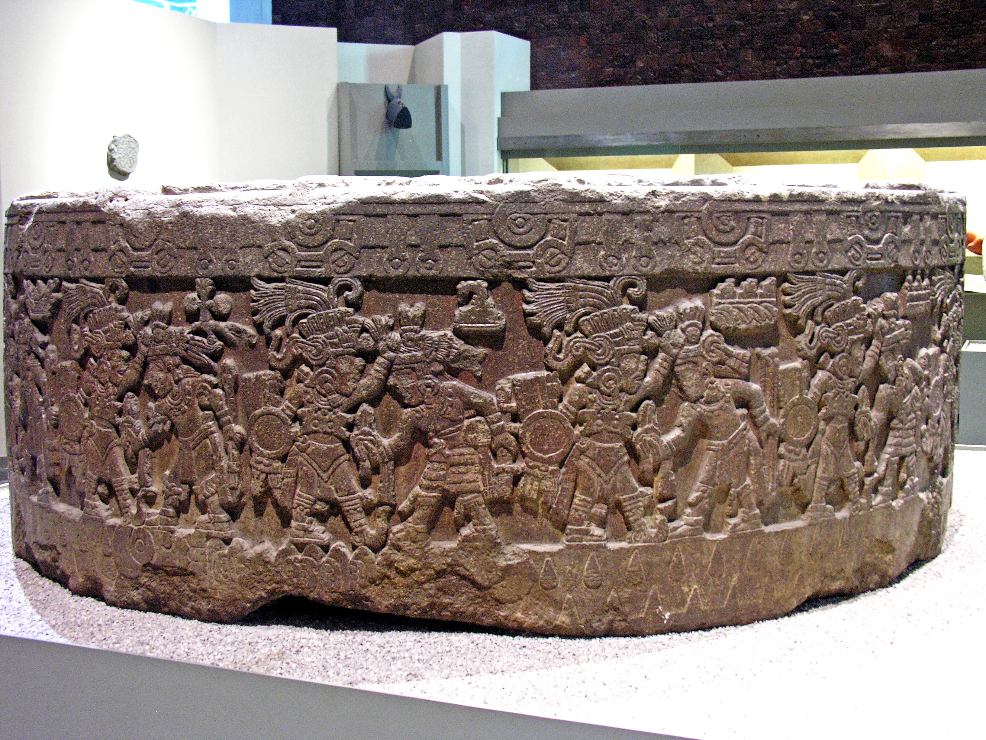 The Tizoc Stone which depicts on its flat upper surface a sun-disk and around its edge a continuous frieze showing the Aztec king Tizoc and other warriors capturing deities of conquered peoples. 15th century CE. (National Museum of Anthropology, Mexico City).