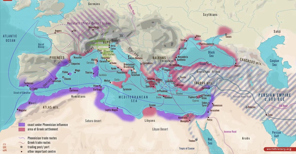 This map illustrates the dynamic trade networks of the ancient Mediterranean between the 7th and 4th centuries BCE, highlighting the spheres of influence of the Phoenicians and Greeks as they established settlements, trading posts, and seafaring routes across the region. It reveals a vibrant commercial landscape shaped by maritime connectivity and cultural exchange, spanning from Iberia to the Levant and deep into the Black Sea and North Africa.