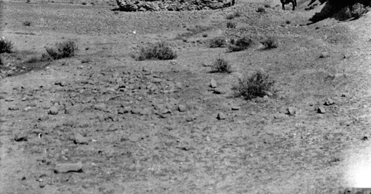 A photograph by Gertrude Bell (l. 1868-1926) of a ruined spiral minaret near the Mosque of Abu Dulaf. Taken in 1909 in Iraq. (Gertrude Bell Archive)