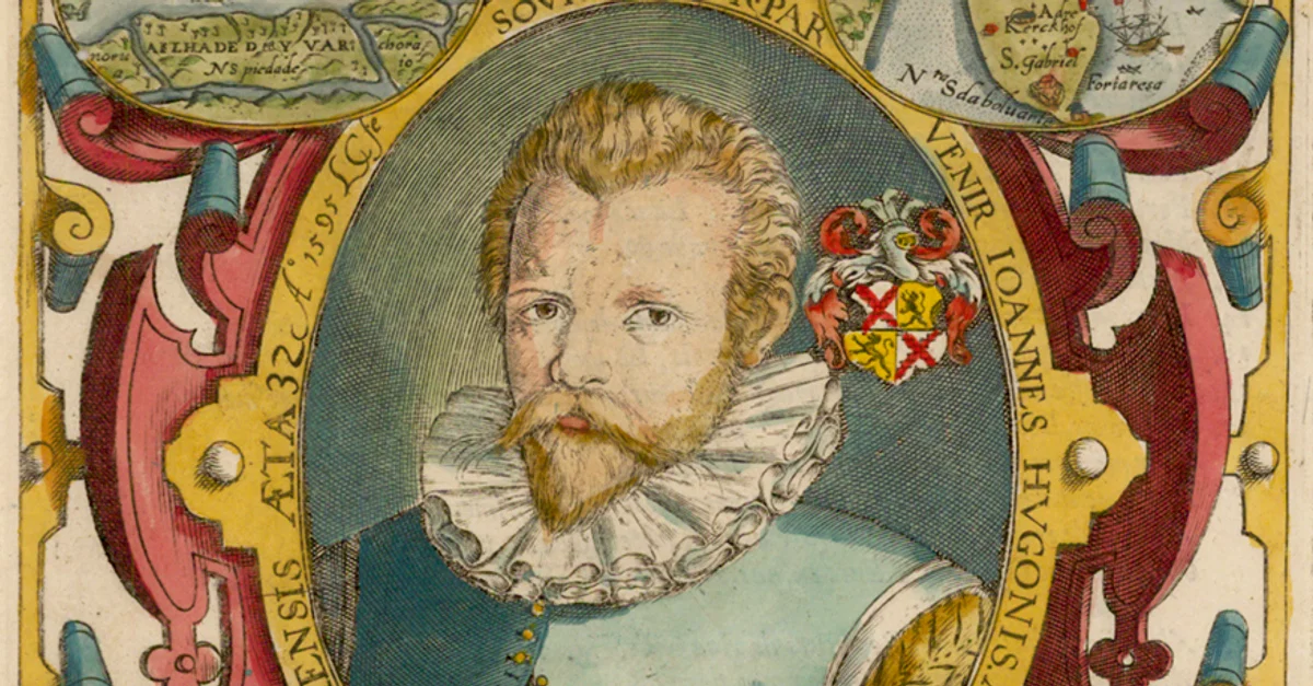 A 17th century portrait of the Dutch traveller and chronicler Jan Huygen van Linschoten (l, 1563-1611). From the princeps edition of his Itinerario.