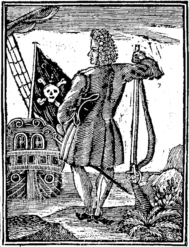 An engraving from c. 1724 of Stede Bonnet, the notorious Barbadian pirate (d. 1718). This version of the Jolly Roger flag was not actually flown by Bonnet but by the British pirate Richard Worley (d. 1718). (From an edition of 'A General History of the Robberies and Murders of the Most Notorious Pyrates' by D. Defoe/Charles Johnson).