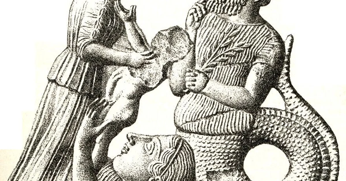 Gaia offers Erichthonios to Athena, with Kekrops watching. Clay relief from Melos, c. 460 BCE. Illustration from Ausführliches Lexikon der griechischen und römischen Mythologie by Wilhelm Heinrich Roscher, 1890.