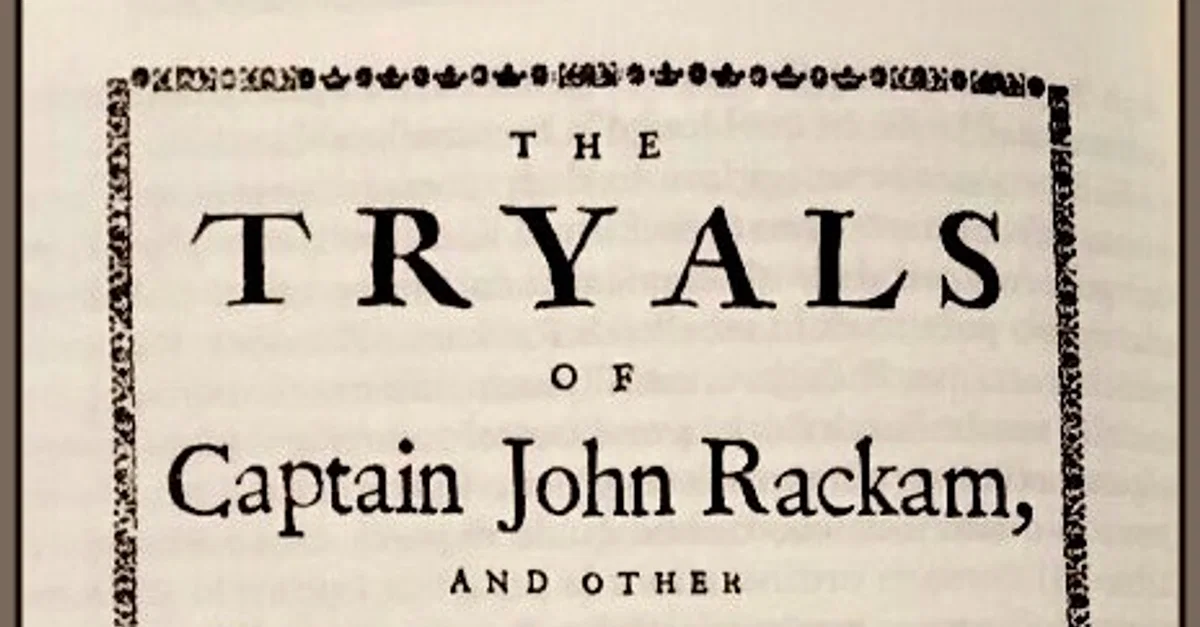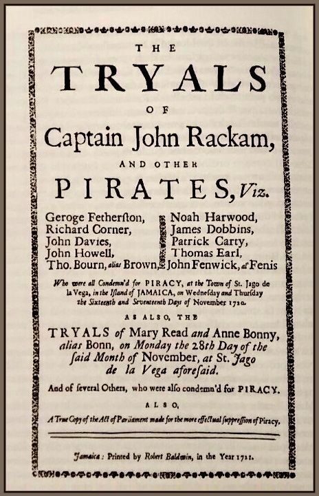 The November 1720 trial notice of John Rackham (aka 'Calico Jack'), Anne Bonny and Mary Read. Issued as part of a pamphlet by the authorities of Jamaica a few days after the trial. All three were found guilty. Rackham was hanged but the two women escaped their sentence because each was pregnant.