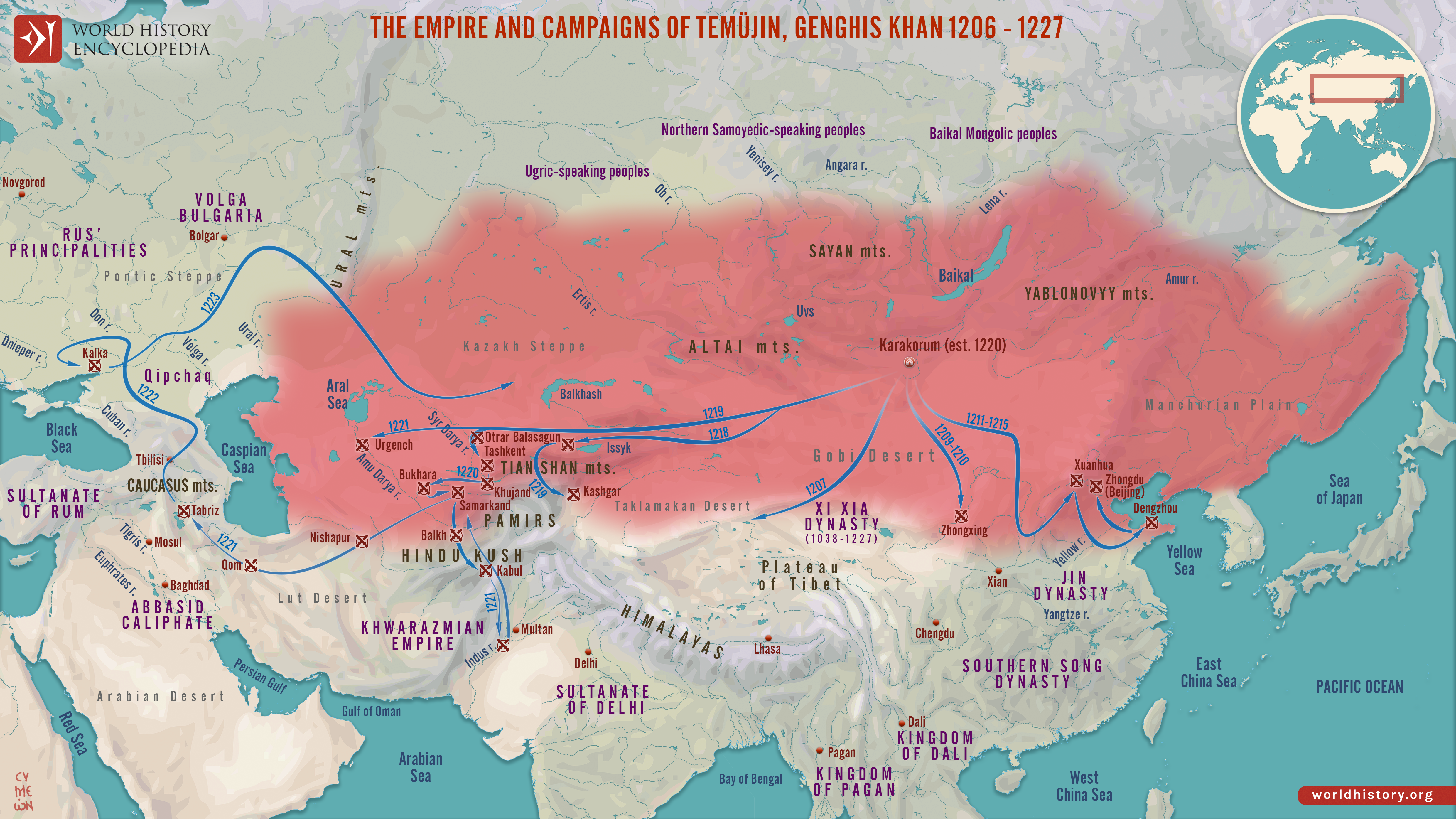 Netchev, S. (2026, February 18). Map of the Mongol Empire: Conquests of Genghis Khan 1206-27: From tribal unification to imperial rule across Eurasia. World History Encyclopedia. https://www.worldhistory.org/image/14496/map-of-the-mongol-empire-conquests-of-genghis-khan/