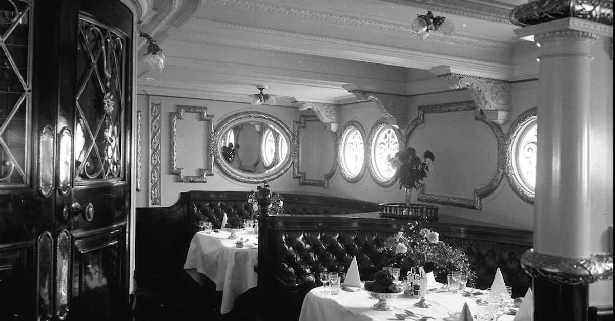 A view of the first-class dining saloon on RMS Empress of Ireland which sank after a collision in 1914. Photograph taken in 1906. (Royal Museums Greenwich Collection)