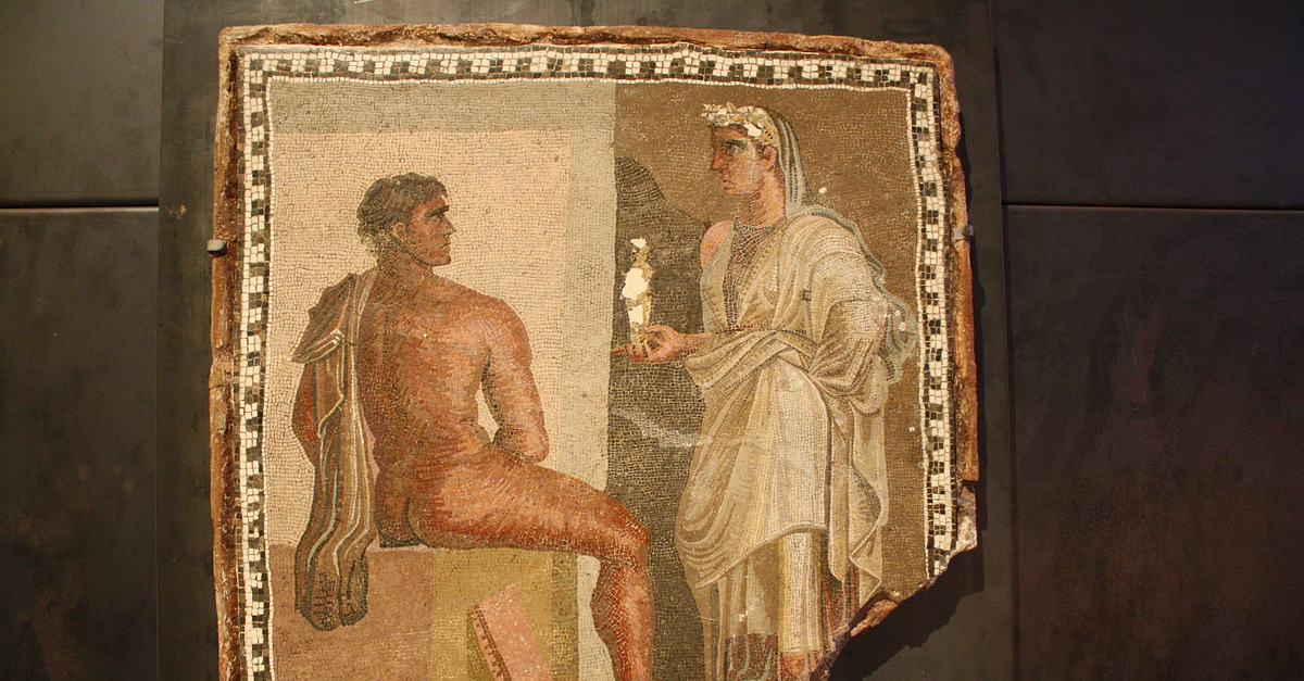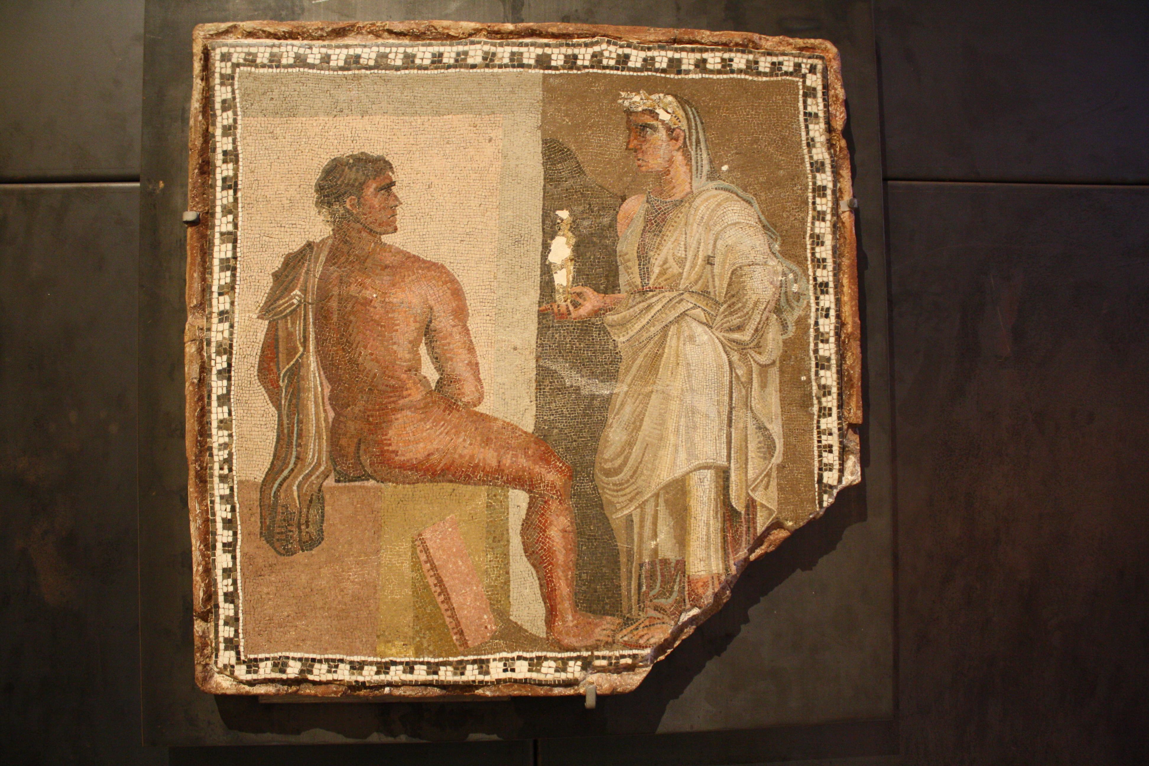 A Roman mosaic depicting Orestes and Iphigenia. The mosaic was the emblemata (centrepiece) of a larger floor mosaic. From the Horti Maccenatiani, 2-3rd century CE. (Capitoline Museums, Rome)