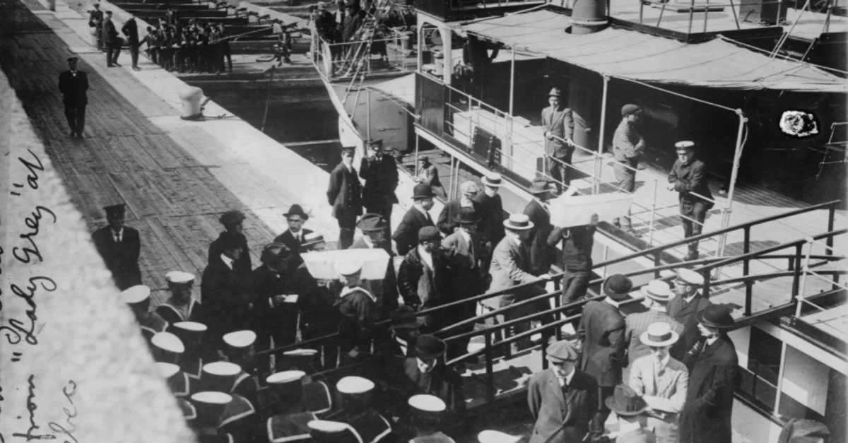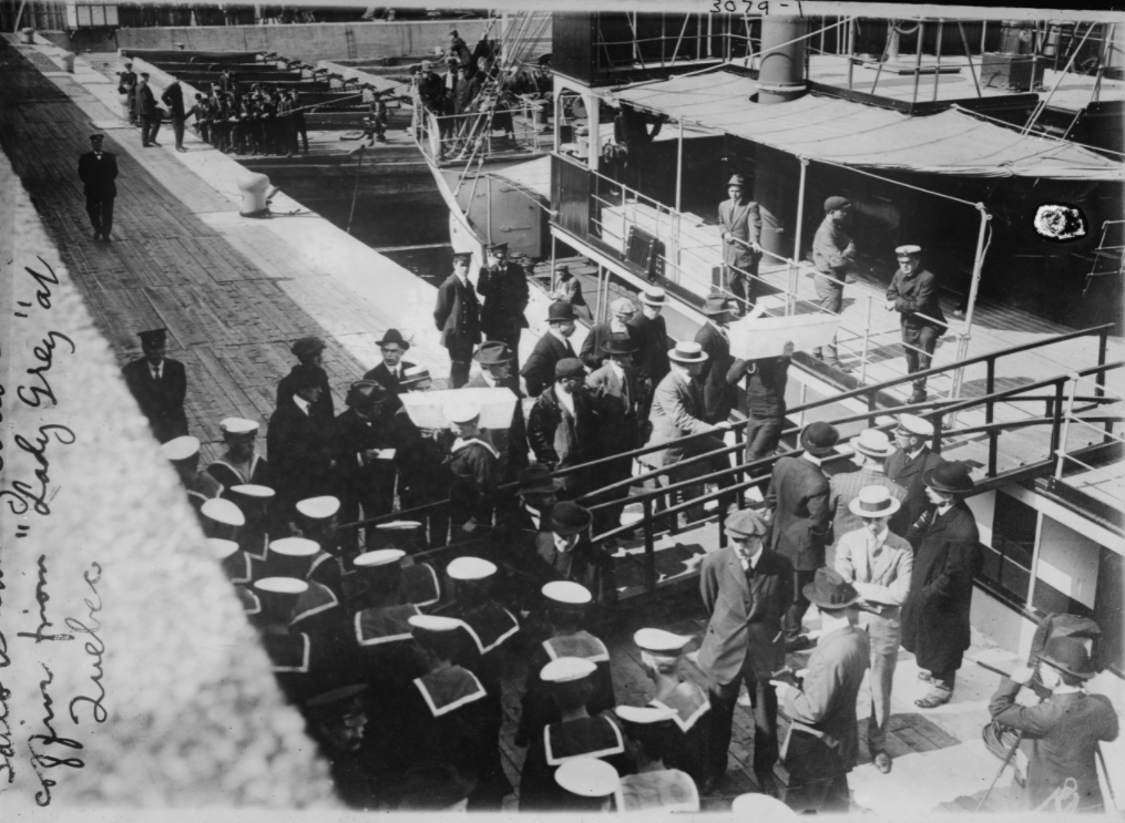A photograph showing the coffins of children being removed from the Lady Grey at Quebec, victims of the sinking of RMS Empress of Ireland in May 1914. (Bain Collection, Library of Congress)