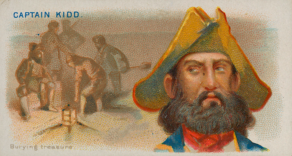 A late-19th century cigarette card showing the Scottish privateer turned pirate Captain Kidd (c. 1645-1701) burying his treasure. William Kidd was found guilty of piracy and hanged in 1701. Produced by Allen & Ginter. Lithographer: George S. Harris & Sons. (Metropolitan Museum of Art, New York)