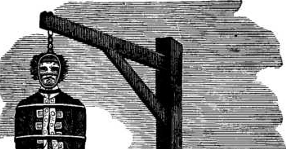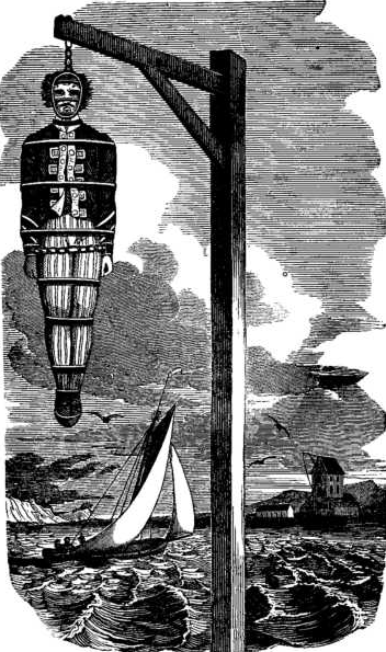 An 1837 illustration showing the fate of the Scottish privateer turned pirate Captain Kidd (c. 1645-1701). William Kidd was found guilty of piracy and hanged at Wapping Old Stairs, London in 1701. His body was then hung in chains to rot as a deterrent to other would-be pirates.