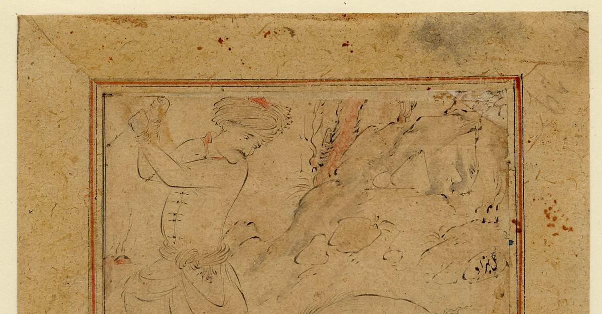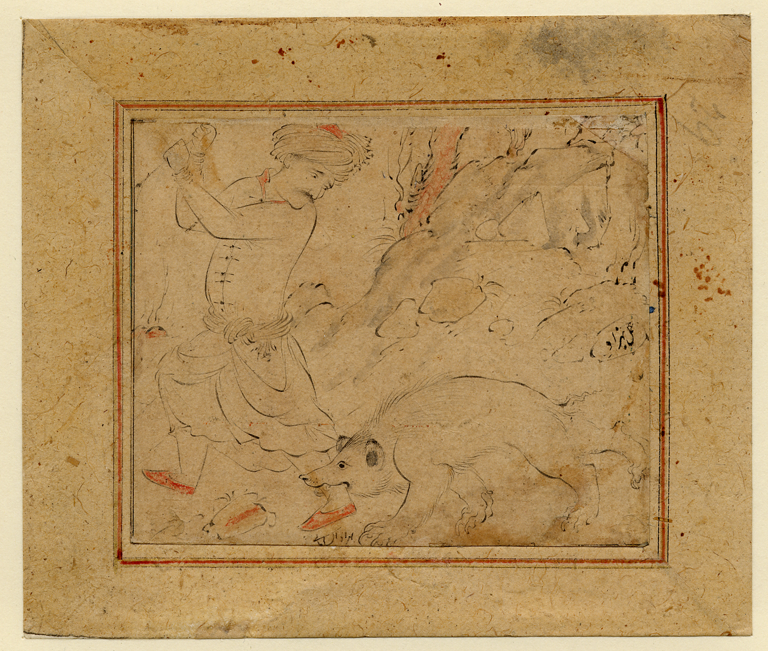 Drawing of a Man Attacked by a Bear by Riza-yi 'Abbasi, falsely ascribed to Kamāl al-Dīn Bihzād, Qazvin, Iran, c. 1590-1595.