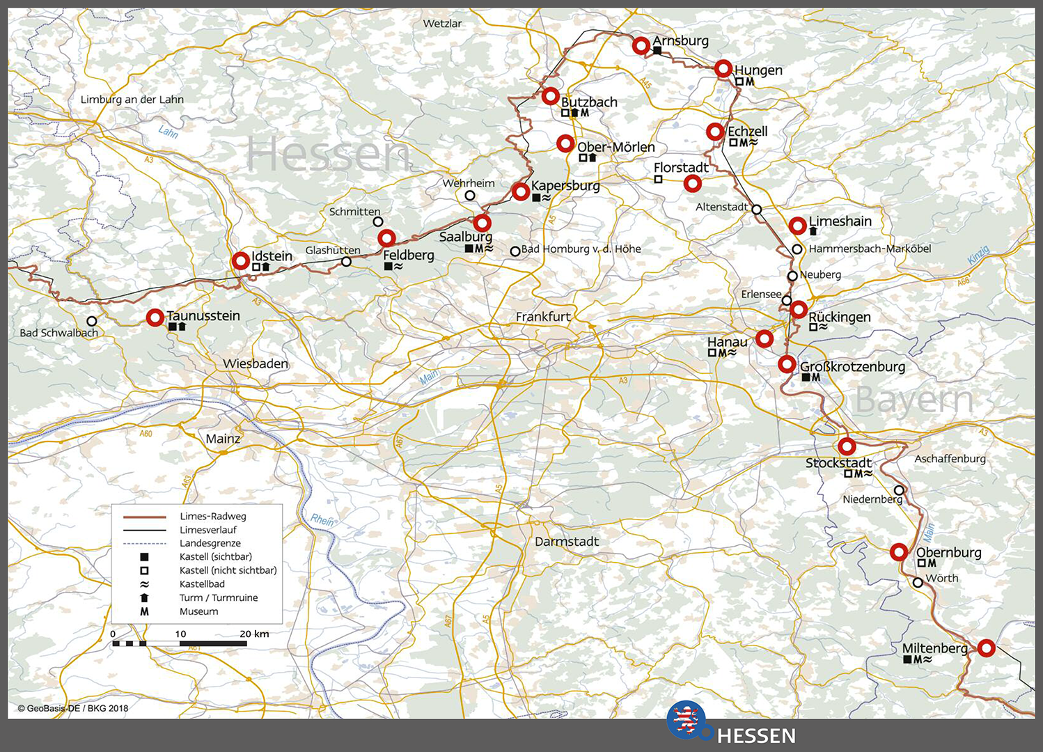 Map showing the sights along the German Limes Road (German: Deutsche Limes-Straße) in the state of Hesse in Germany.
