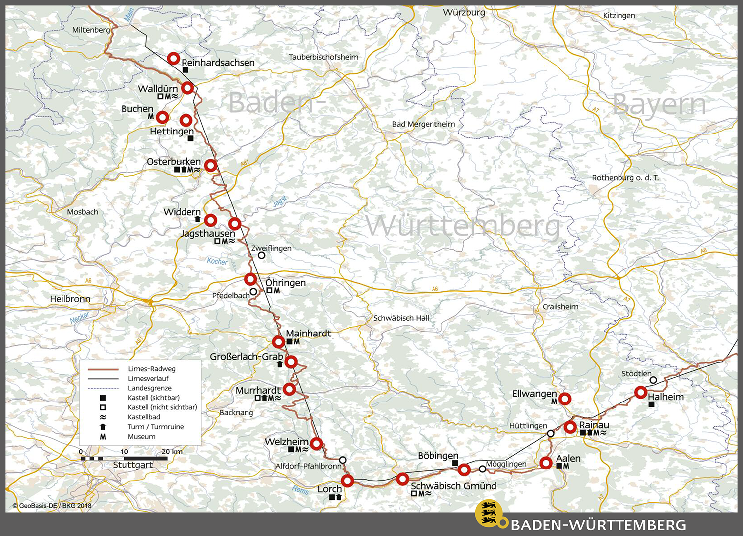 Map showing the sights along the German Limes Road (German: Deutsche Limes-Straße) in the state of Baden Württemberg in Germany.