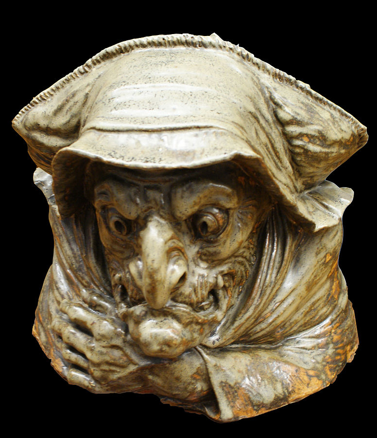 A sculpture of Baba Yaga. Baba Yaga is a character from Slavic folklore who was said to be an evil spirit taking the form of the old woman. She was often portrayed as a caricaturally ugly person with a hooked nose and wrinkled face. The sculpture was made in 1898.