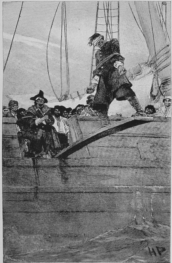 An illustration of a victim walking the plank by Howard Pyle (1853-1911). Published to illustrate Buccaneers and Marooners of the Spanish Main in Harper's Magazine, 1887.