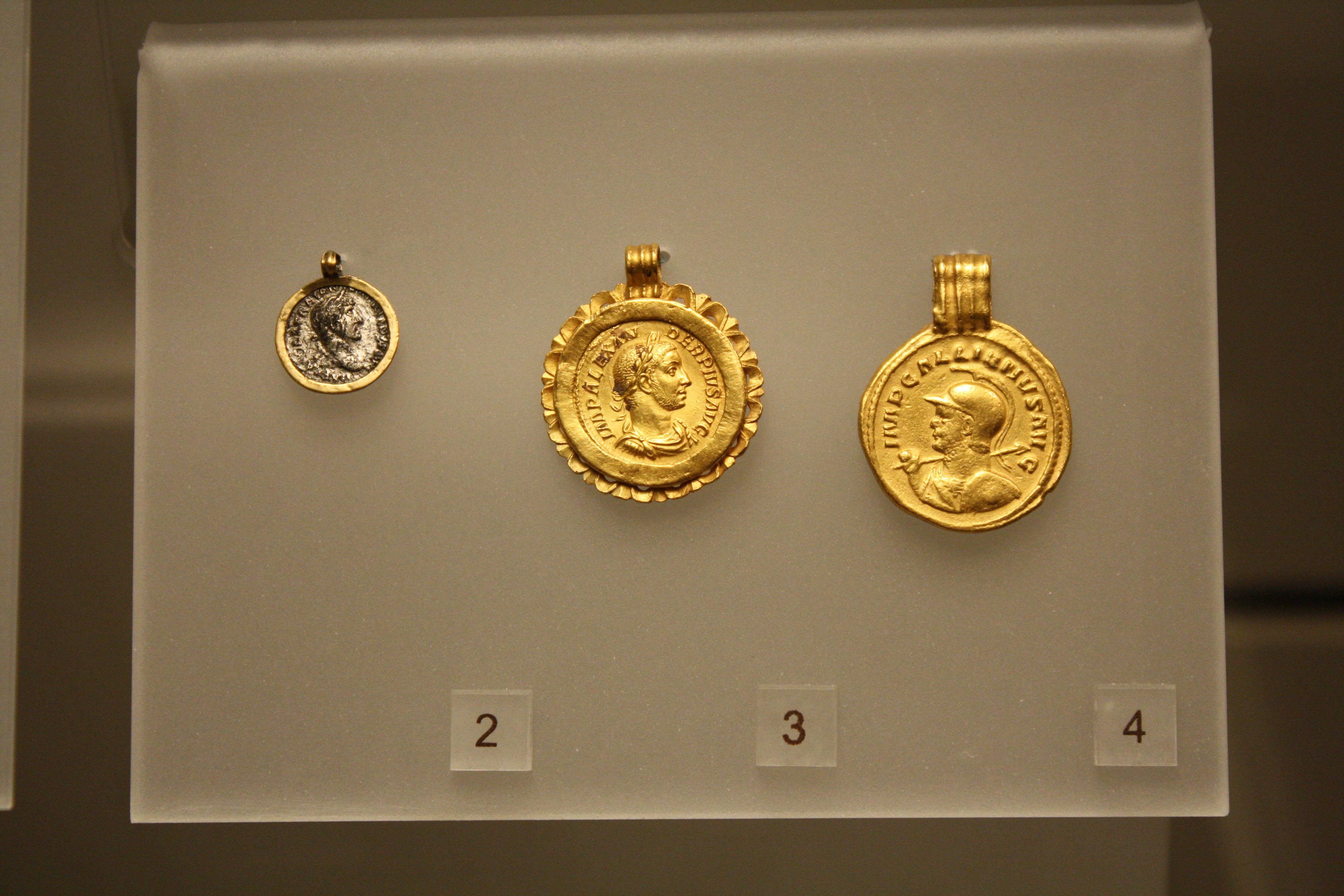 Roman gold pendants depicting various emperors. The far left pendant shows Hadrian (119-132 CE), the central shows Severus Alexander (222-235 CE), and the right example shows Gallienus as Mars (253-268 CE). (Palazzo Massimo, Rome)