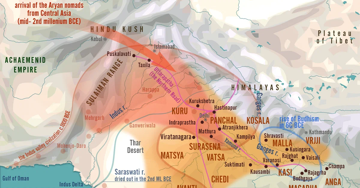 A map illustrating the evolution of the cultures on the northern Indian subcontinent with the arrival of the Aryan nomads during the late Bronze Age and early Iron Age known as the Vedic age (c. 1500 – c. 500 BCE), when the Vedic literature was composed, between the end of the Indus Valley Civilisation and the establishment of the Mahajanapadas ("Great Realms") on the central Indo-Gangetic Plain c. 500 BCE.
