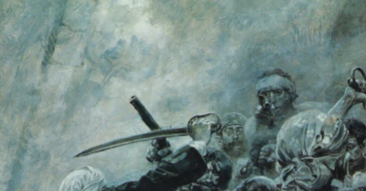 An illustration by Howard Pyle (1853-1911) showing the notorious pirate Blackbeard's fight to the death in 1718. From an original oil painting by Pyle. (The illustration first appeared in Pyle, Howard (1894), Jack Ballister's Fortunes, The Century Company)
