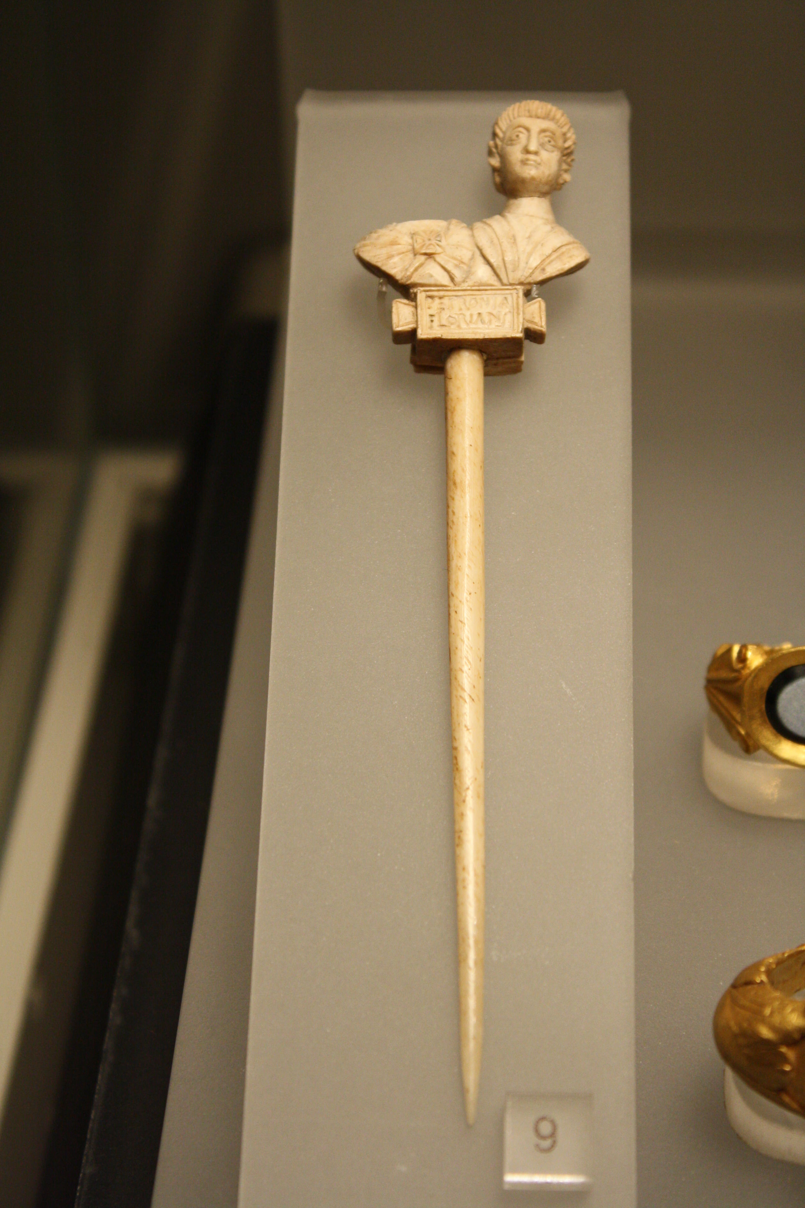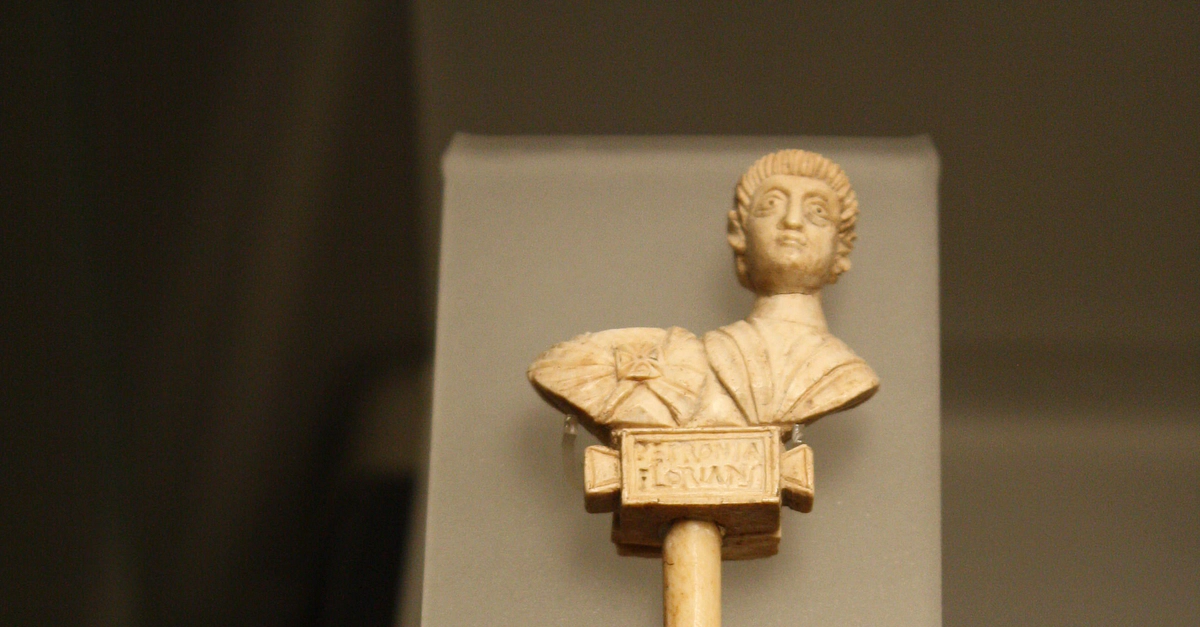 A Roman hairpin made from bone, second half of the 4th century CE. One of the two busts at the head has broken off. The inscription reads 'Petronia Florian(u)s'. (Palazzo Massimo, Rome)