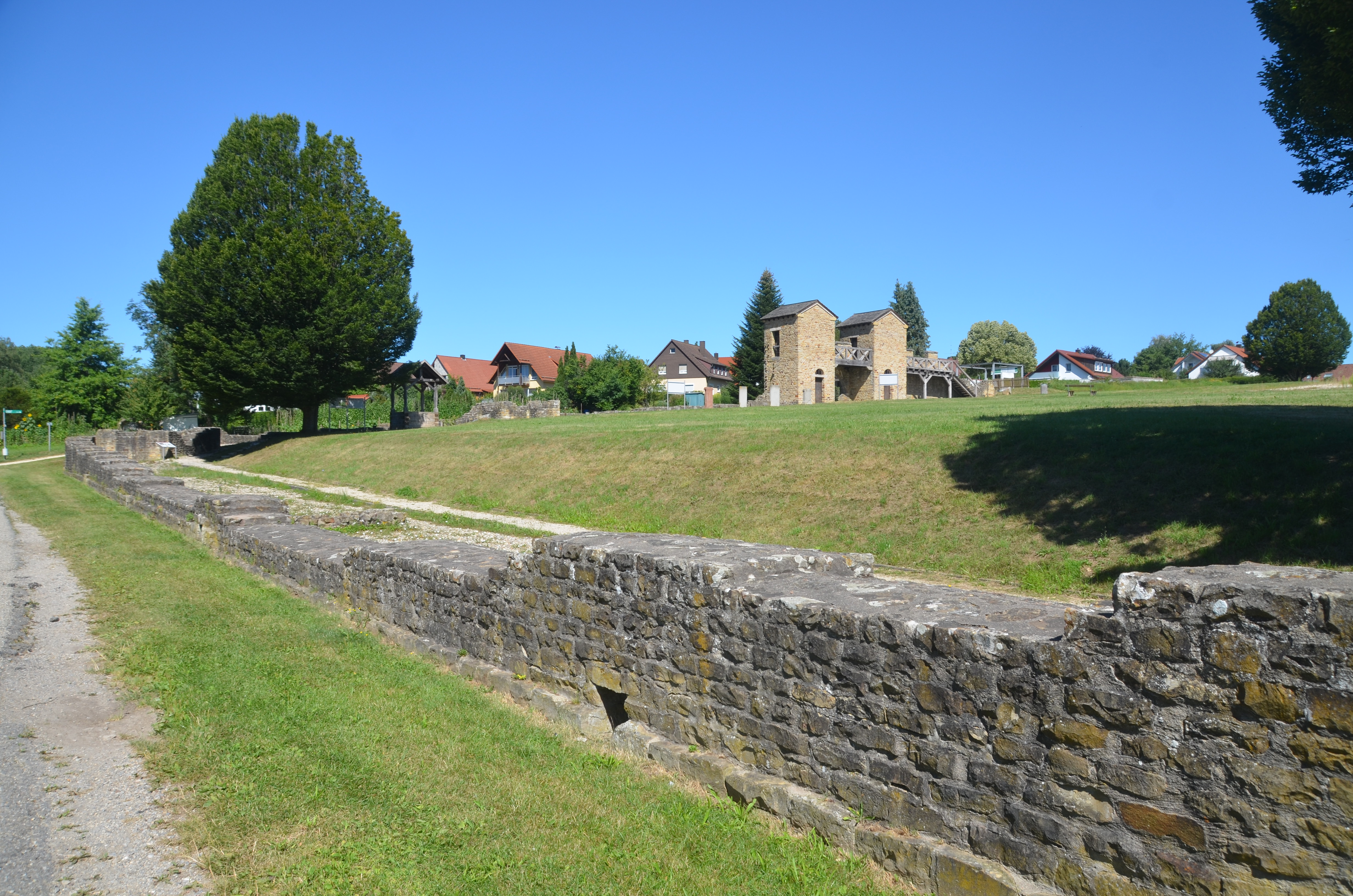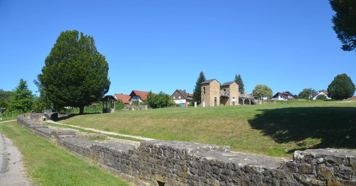 The east fort (Ostkastell) at Welzheim in Baden-Württemberg, Germany. The site has been designed as an archaeological park with replicas of Roman stone monuments and explanatory plaques about Roman Welzheim. The fort was built in 160 CE and covered an area of 1.6 hectares.