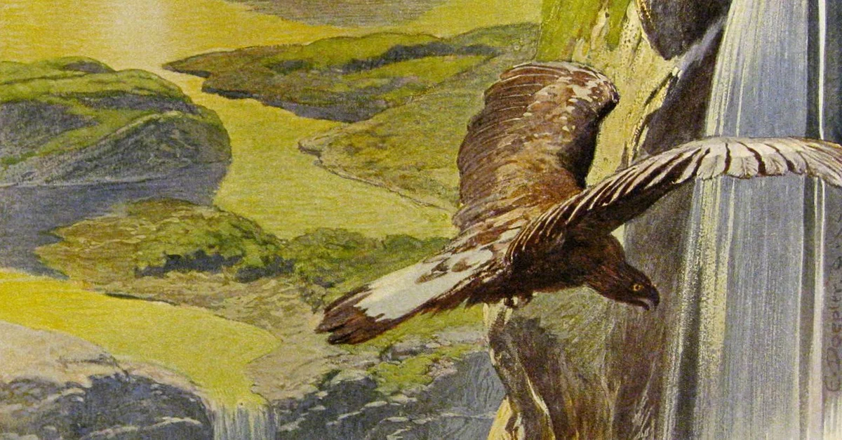 The scene depicts the line from the Völuspá "Waterfalls flow and eagles fly overhead, hunting for fish among the mountain peaks" (Stanza 57). The illustration evokes the rebirth of the world following the destruction and death of Ragnarök.