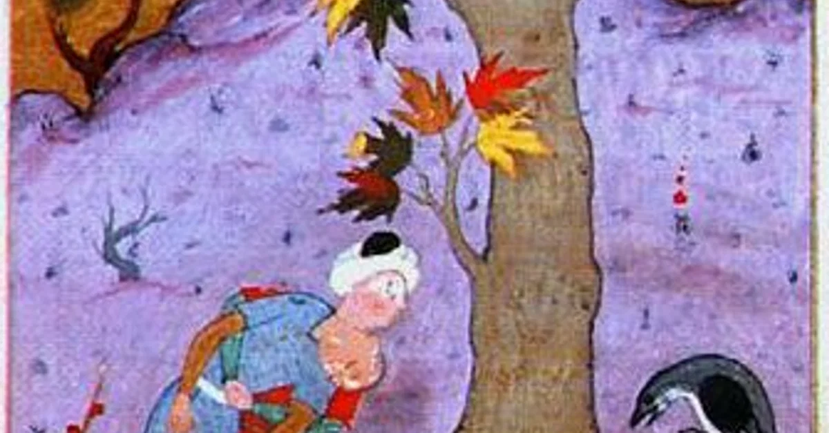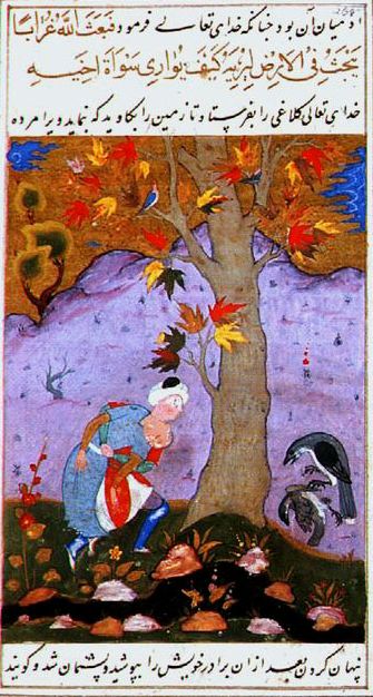 Cain burying his brother Abel, illustration from an Islamic illuminated manuscript of the Stories of the Prophets, 11th century CE.