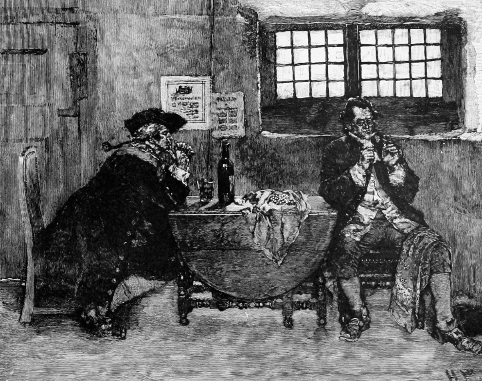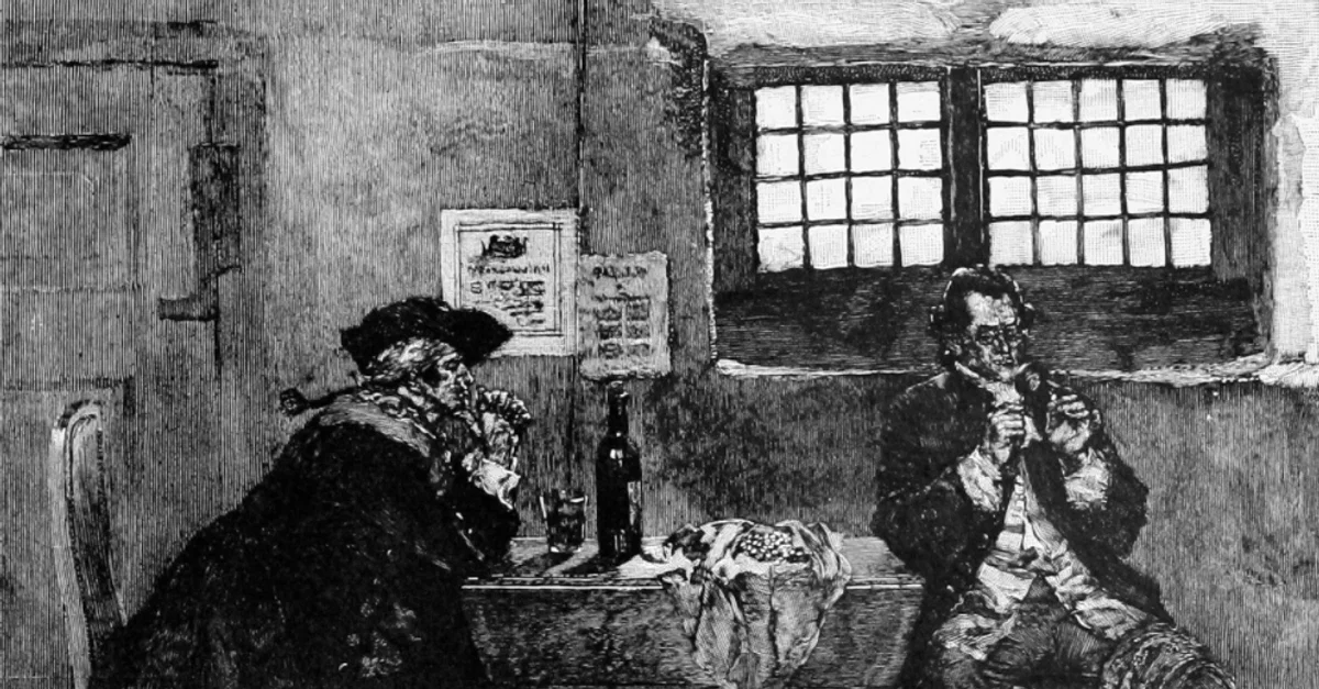 An illustration by Howard Pyle showing the English pirate Henry Every selling jewels to a fence. Every captured fabulous treasure from an Indian treasure ship in 1695 and disappeared soon after never to be seen again.