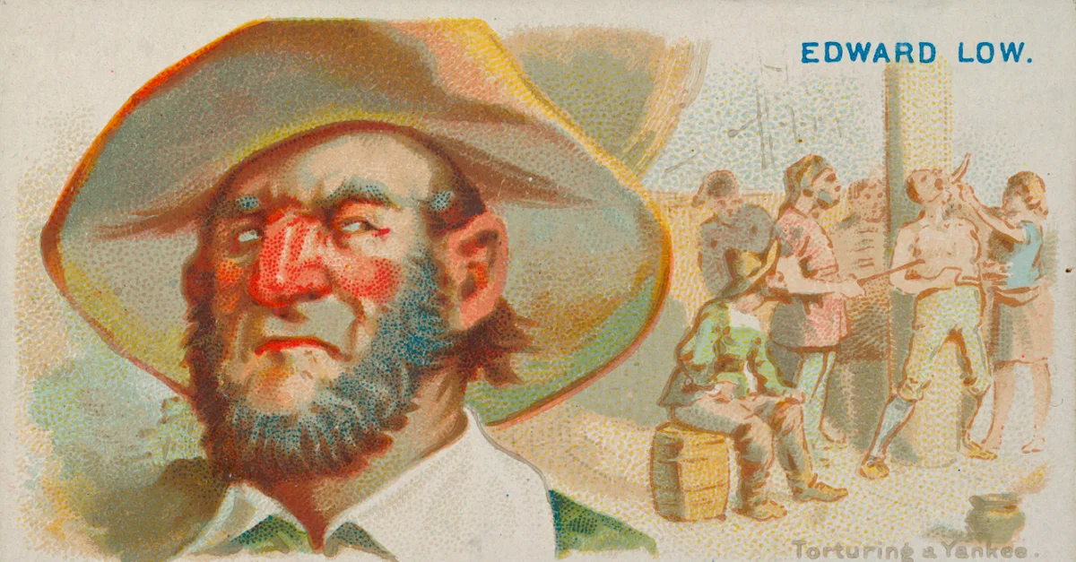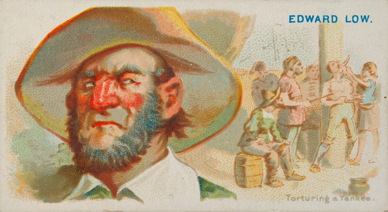 A late-19th century cigarette card showing the notorious English pirate Edward Low who was active in the Caribbean and eastern Atlantic from 1721 to 1724 during the Golden Age of Piracy (1690-1730). Low was known for his acts of cruelty on his captives. Produced by Allen & Ginter. Lithographer: George S. Harris & Sons. (Metropolitan Museum of Art, New York)