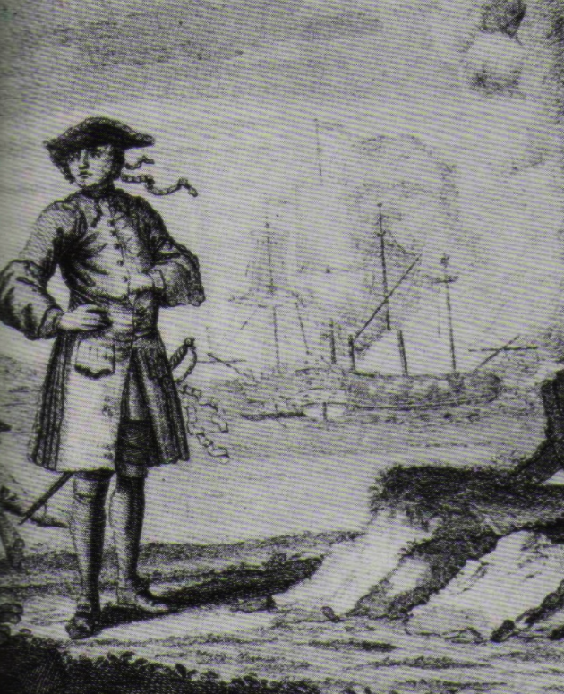 An 18th-century engraving showing the pirate Edward England and his ship Fancy attacking the East India Company ship Cassandra in 1720.