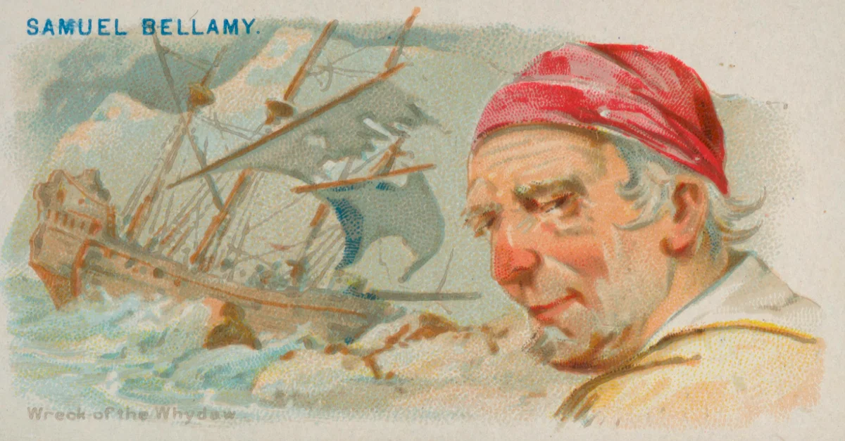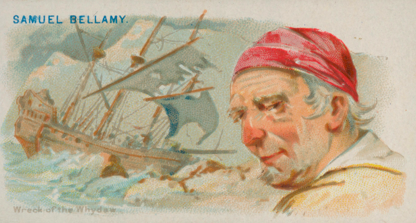 A late-19th century cigarette card showing the British pirate Captain Samuel Bellamy (d. 1717). Bellamy died when his ship the Whydah was wrecked in a storm off Cape Cod. Produced by Allen & Ginter. Lithographer: George S. Harris & Sons. (Metropolitan Museum of Art, New York)