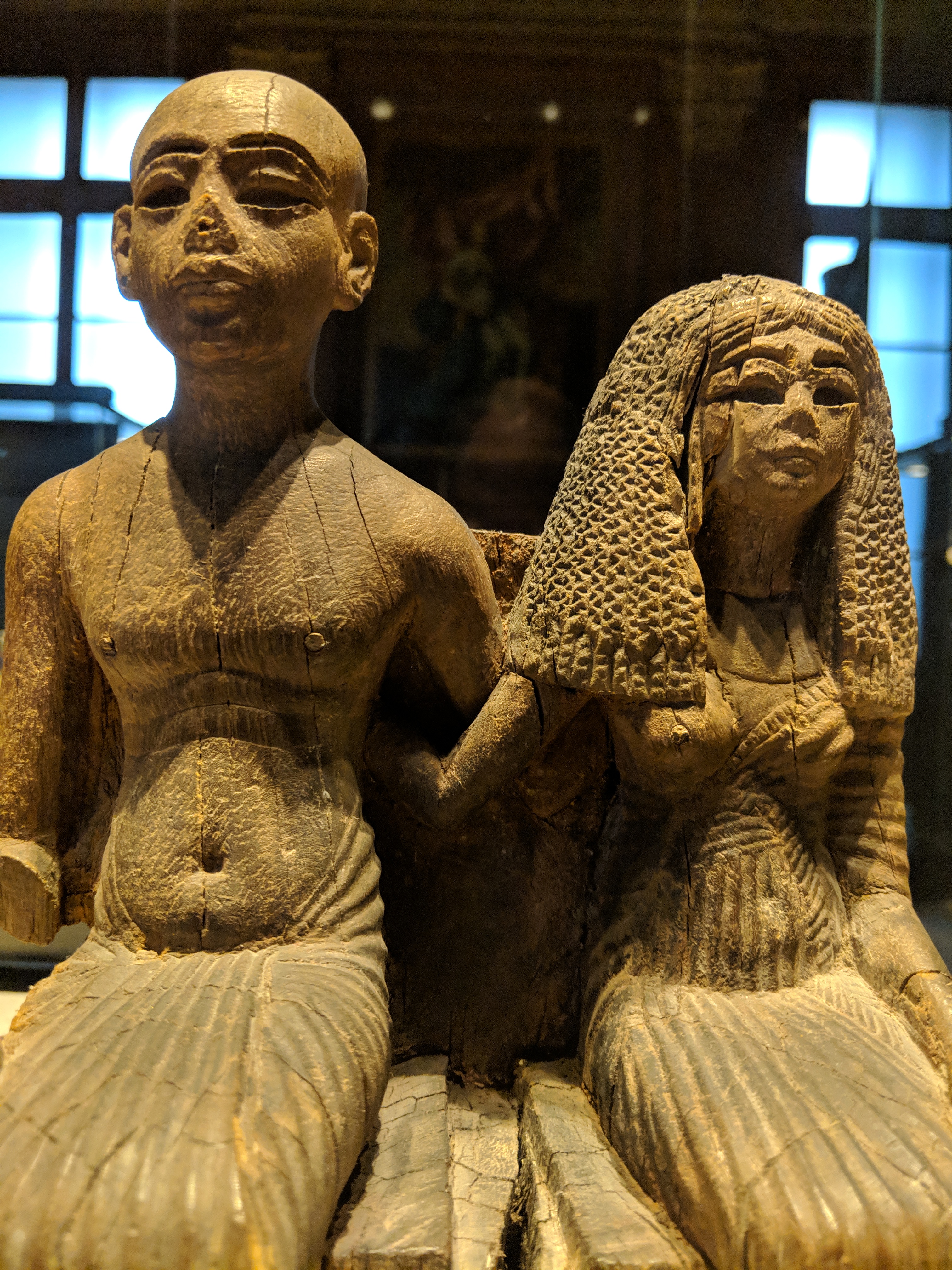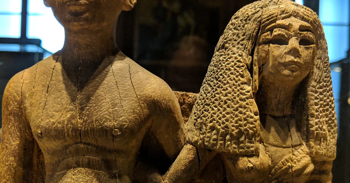 Wooden figurine depicting an Egyptian couple (c. 1350-1300 BCE): Sementaoy, servant of the king, and his wife Rouiay, singer of Amon. Underneath the seat of the wife, a pet monkey is eating fruit (not visible in this photo).