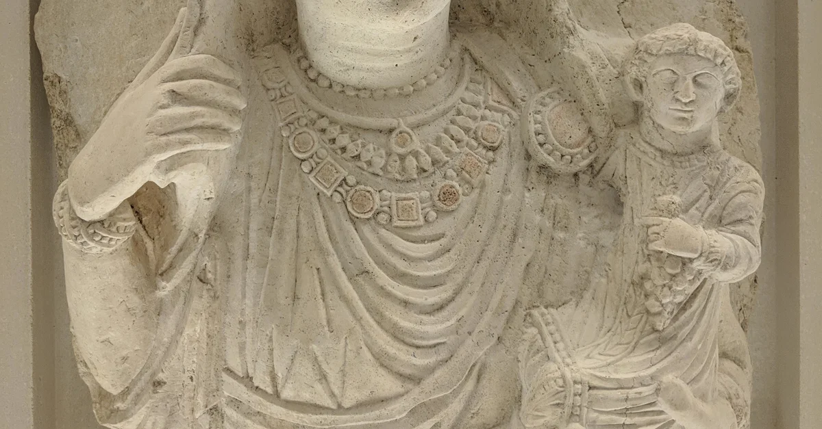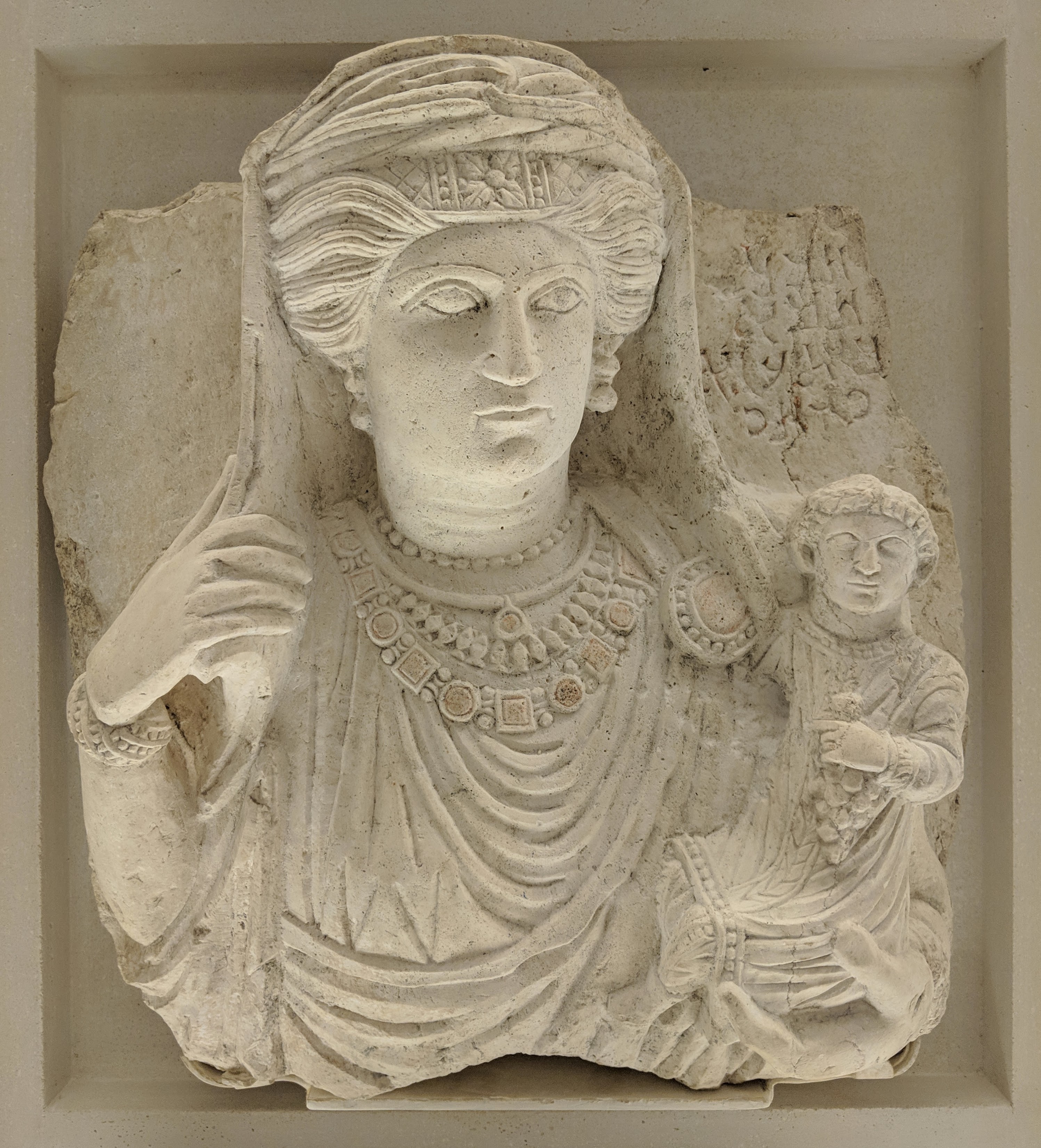 Bust of Habba, daughter of 'Oga, son of Yarhai, shown carrying a child on her left arm. 3rd century CE, Palmyra, modern-day Syria.