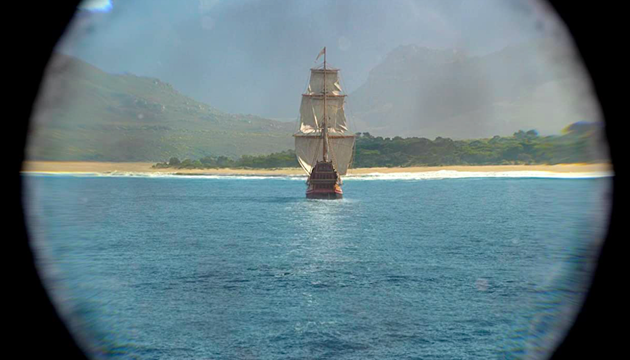 A sailing ship typical of the Golden Age of Piracy (1690-1730) as seen through a telescope. From the TV series Black Sails.