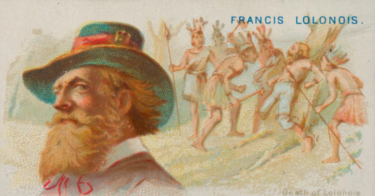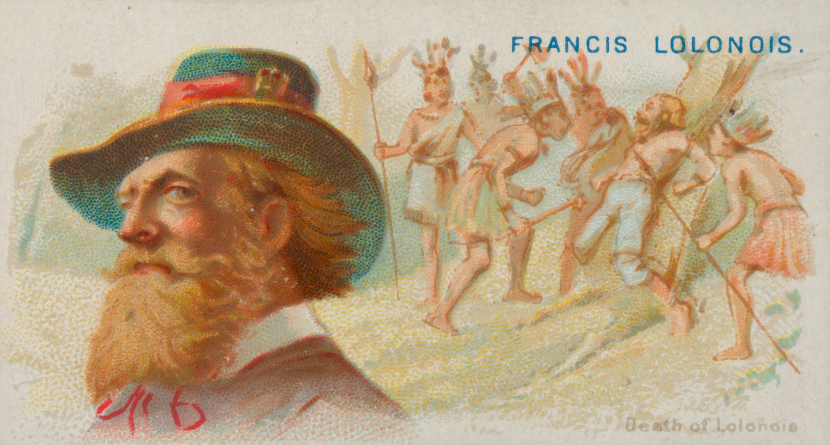 A late-19th century cigarette card showing the French buccaneer and pirate François L'Olonais (1630-1668). L'Olonias was the cruellest of all buccaneers, torturing and executing almost all of his captives during a brutal career attacking the Spanish Main. He was tortured and killed by cannibals in 1688. Produced by Allen & Ginter. Lithographer: George S. Harris & Sons. (Metropolitan Museum of Art, New York)
