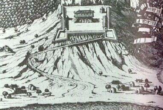 The fortress built by Jean Le Vasseur from 1642 on the island of Tortuga (Ile de la Tortue), located in northwest Hispaniola (modern Haiti and the Dominican Republic). Tortuga became a major haven for the buccaneers like François L'Olonias (1630-1668).