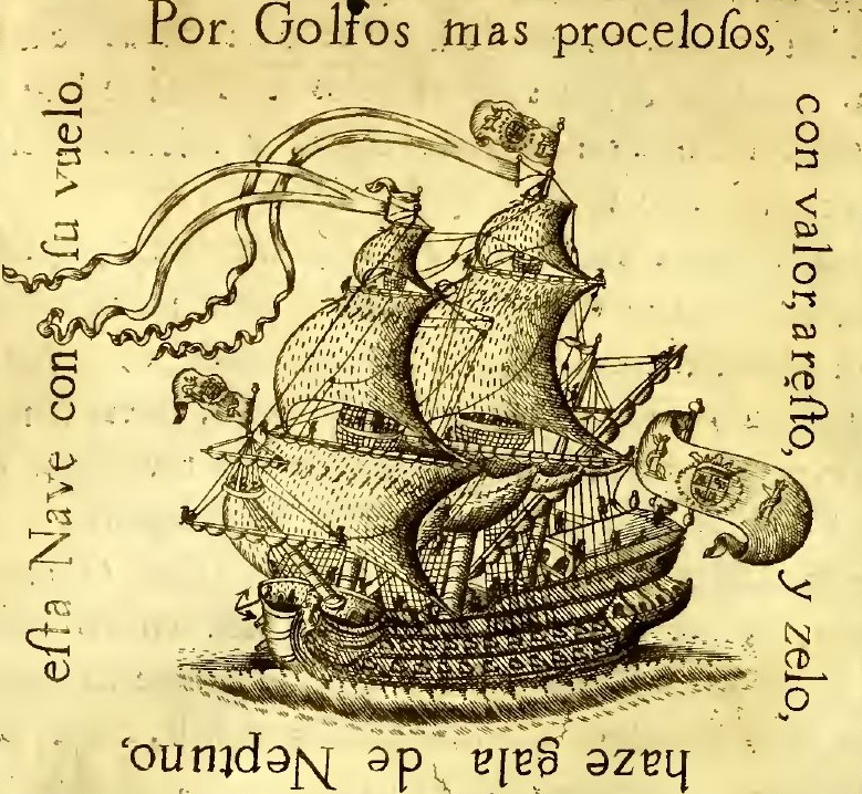 A 1734 copper print of a Spanish galleon. The text reads: Por Golfos mas procelosos, con valor, aresto y zelo, hace gala de Neptuno, esta Nave con su vuelo. - "Through the worst stormy waters, with courage, purpose, and zeal, this ship shows off its sails to Neptune."