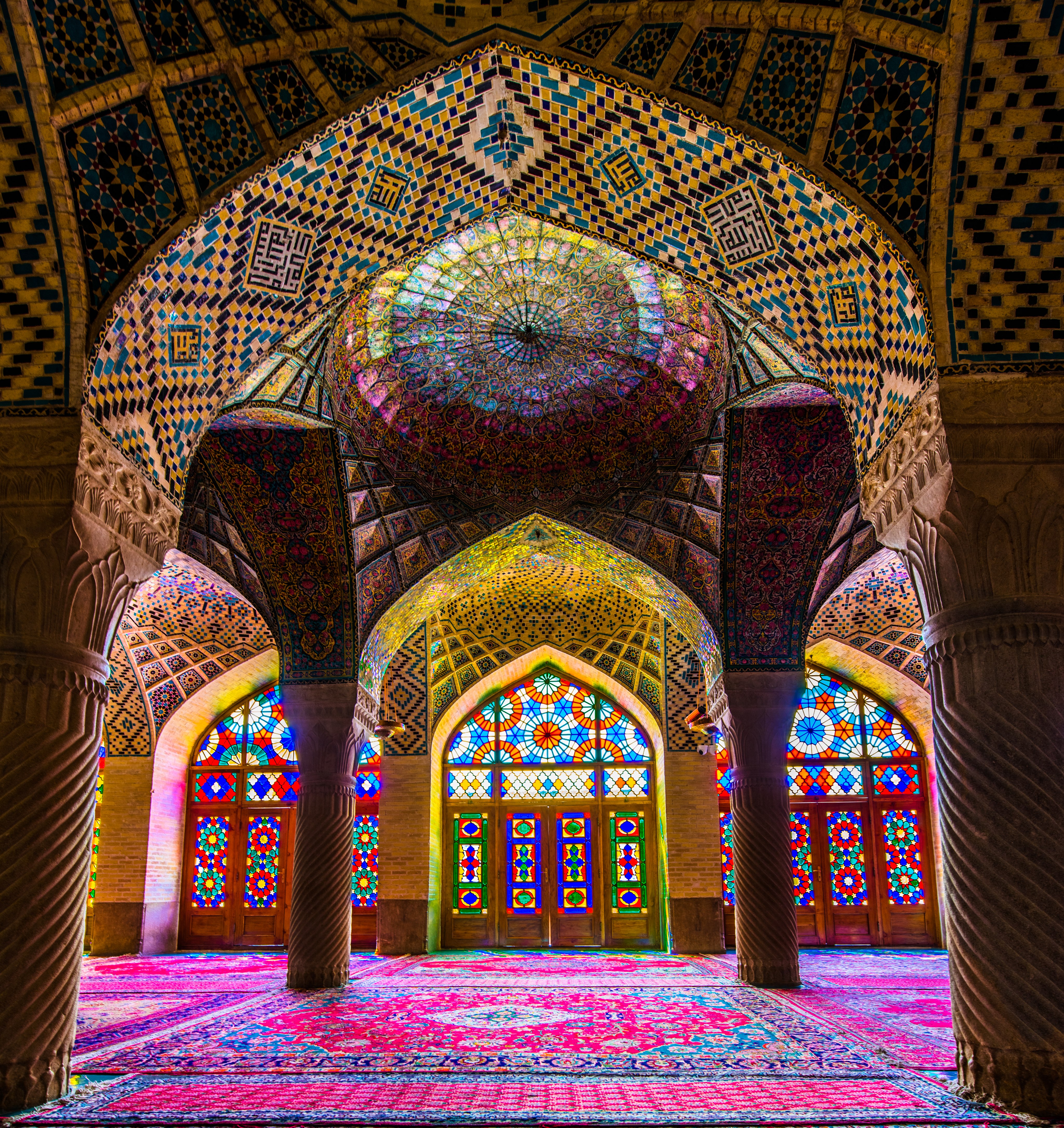 An interior view of the Nasir al-Mulk (Nasir-ol-Molk) Mosque, also known as the Pink Mosque, in Shiraz (Iran). The mosque was constructed between 1876 CE and 1888 CE, during the Qajar dynasty.