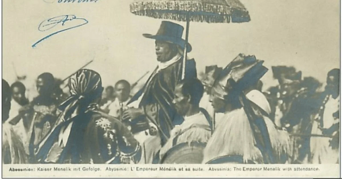 Menelik II, emperor of Ethiopia (r. 1889-1913) and his attendants, German postcard, approximately 1905.