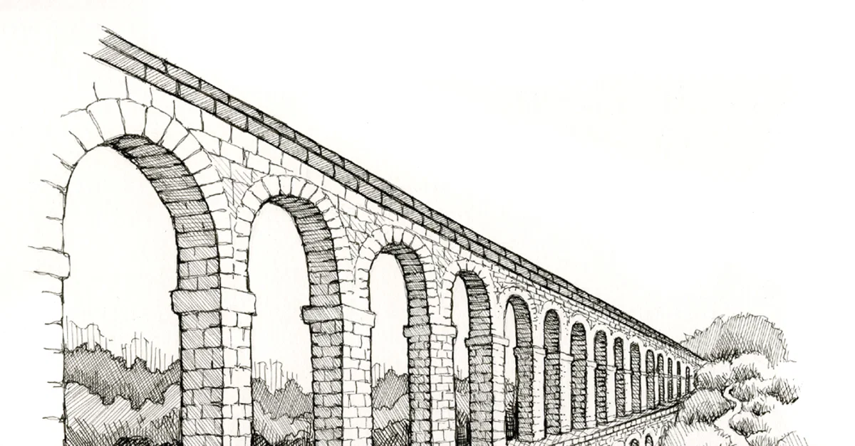 An illustration by Maia Kobabe showing an ancient aqueduct.