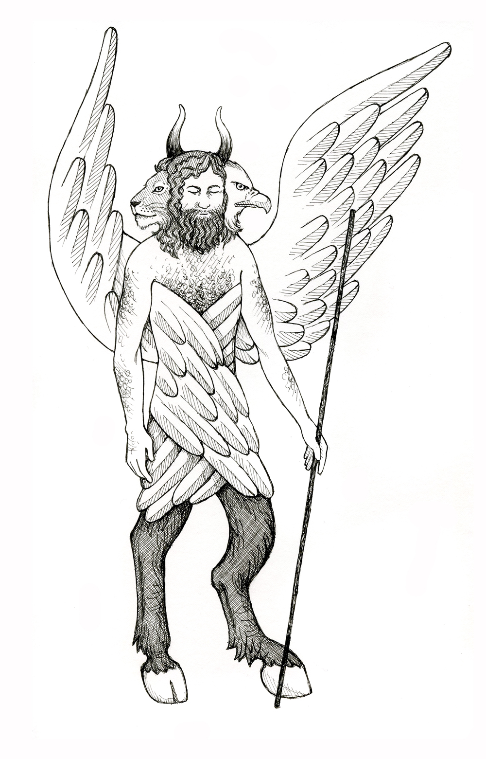 An illustration by Maia Kobabe showing a cherub. These multi-headed beings appear in Abrahamic religions where they often function as attendant angels.