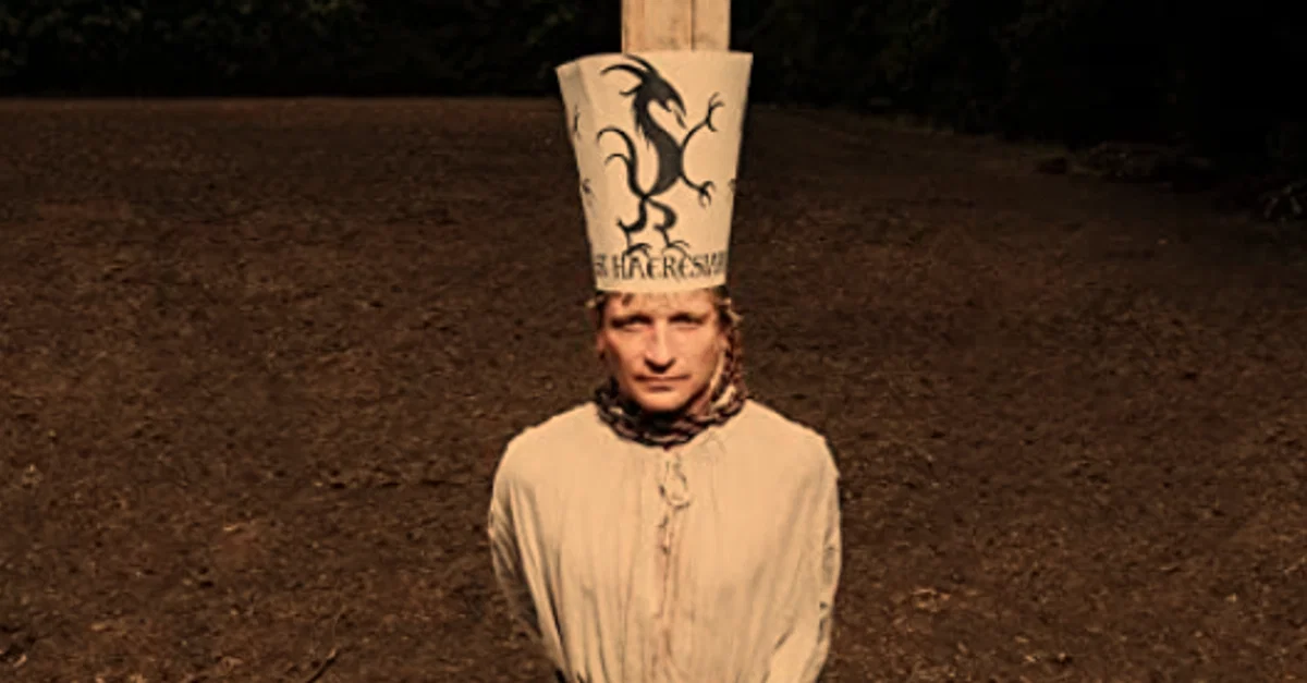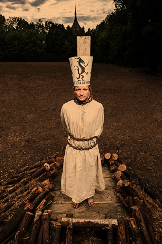 Matej Hádek as Czech theologian and reformer Jan Hus (l. c. 1369-1415) being burned at stake for his critique of the medieval Church, in the movie titled Jan Hus (2015). Image by Czech Television.