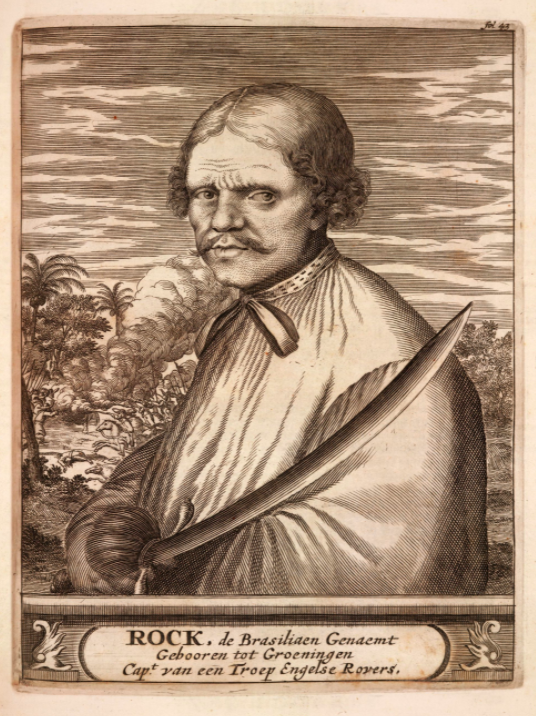 A 17th-century illustration of the Dutch privateer and pirate Roche Brasiliano (active 1650s to 1660s). From an early edition of Alexander Exquemelin’s Buccaneers of America, first published in Dutch in 1678.