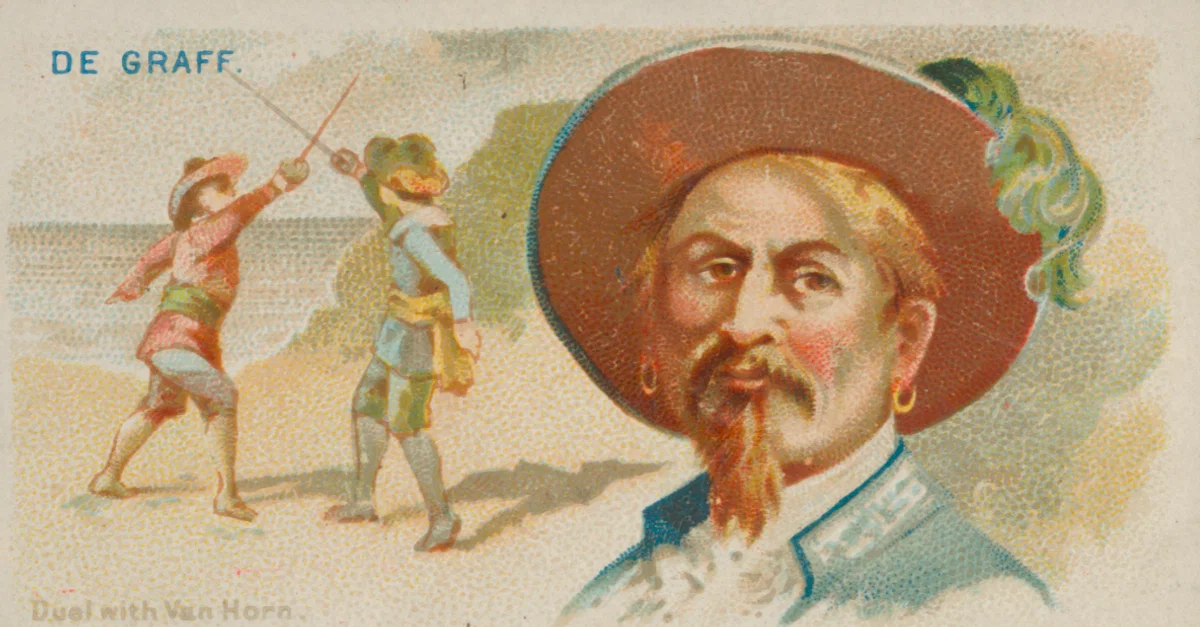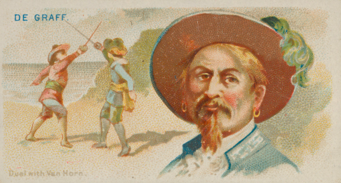 A late-19th century cigarette card showing the Dutch pirate and privateer Laurens de Graaf (active 1682 to 1695). Produced by Allen & Ginter. Lithographer: George S. Harris & Sons. (Metropolitan Museum of Art, New York)