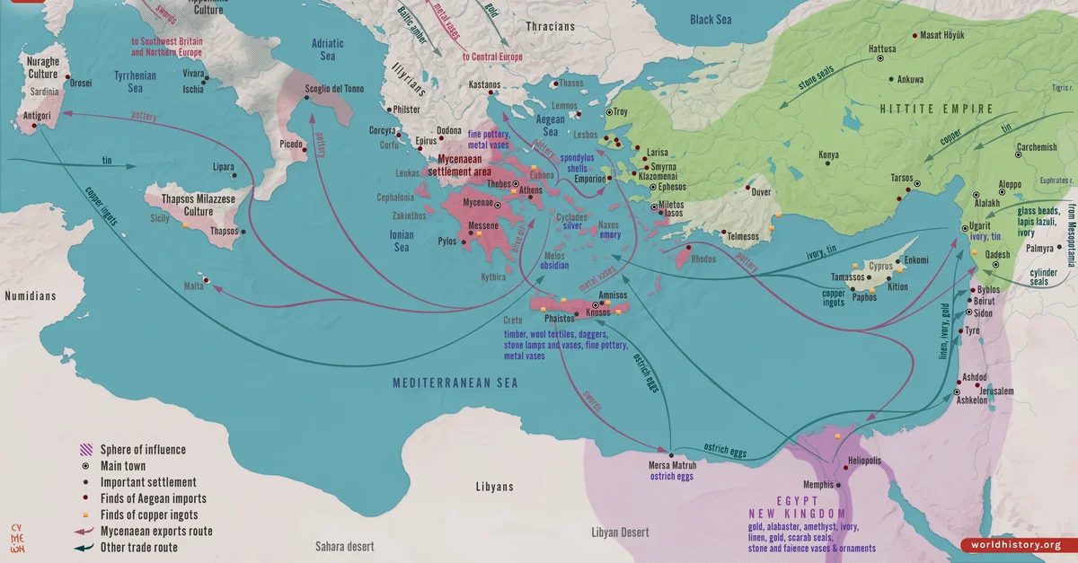 Netchev, S. (2021, November 19). Late Bronze Age Mediterranean Trade, c. 1400-1200 BCE: Empires, Merchants, and Maritime Routes of the Ancient World. World History Encyclopedia. https://www.worldhistory.org/image/14880/late-bronze-age-mediterranean-trade-c-1400-1200-bc/