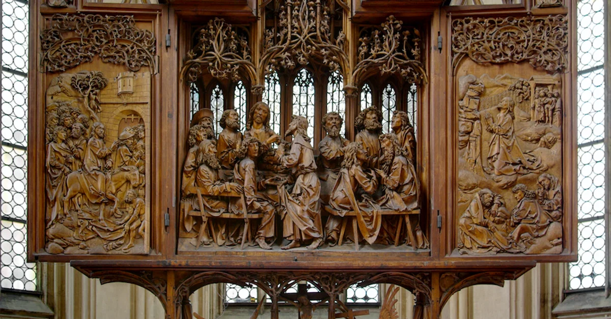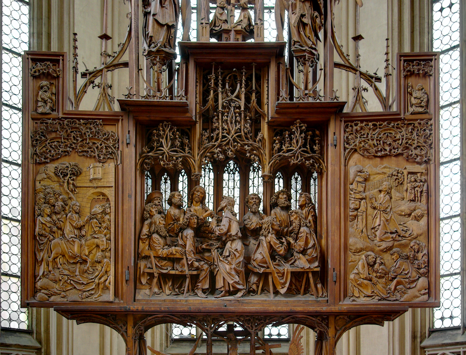 The Altarpiece of the Holy Blood in the church of Saint Jacob, Rothenburg, Germany. Made of glazed limewood by Tilman Riemenschneider (c. 1460-1531), it was completed by 1505. It shows the Last Supper in the central panel while the left panel shows the Entry into Jerusalem and the right panel Judas. It was designed to showcase the chapel which contained a holy relic of Jesus Christ’s blood.