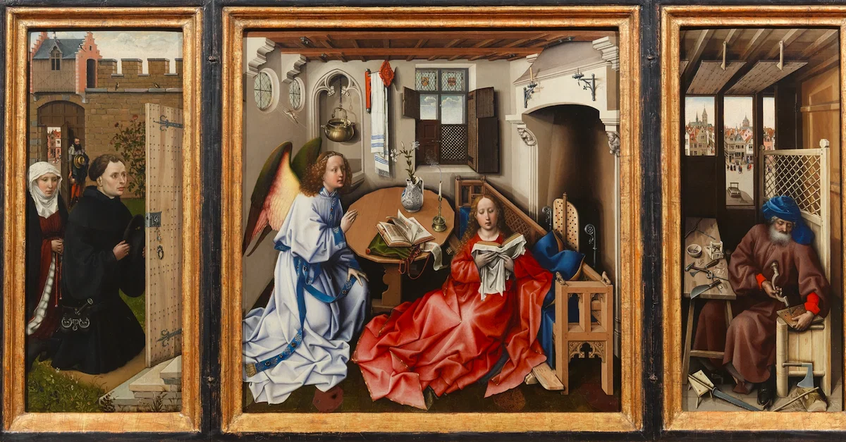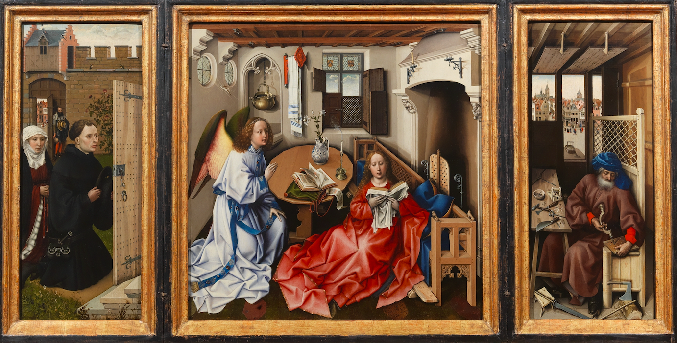 The c. 1425 triptych Mérode altarpiece by Robert Campin. It is one of the most celebrated of smaller altarpieces meant for private use. It measures open 118 x 65 cm and shows the Annunciation using an interesting early attempt at spatial perspective. (Metropolitan Museum of Art, New York)