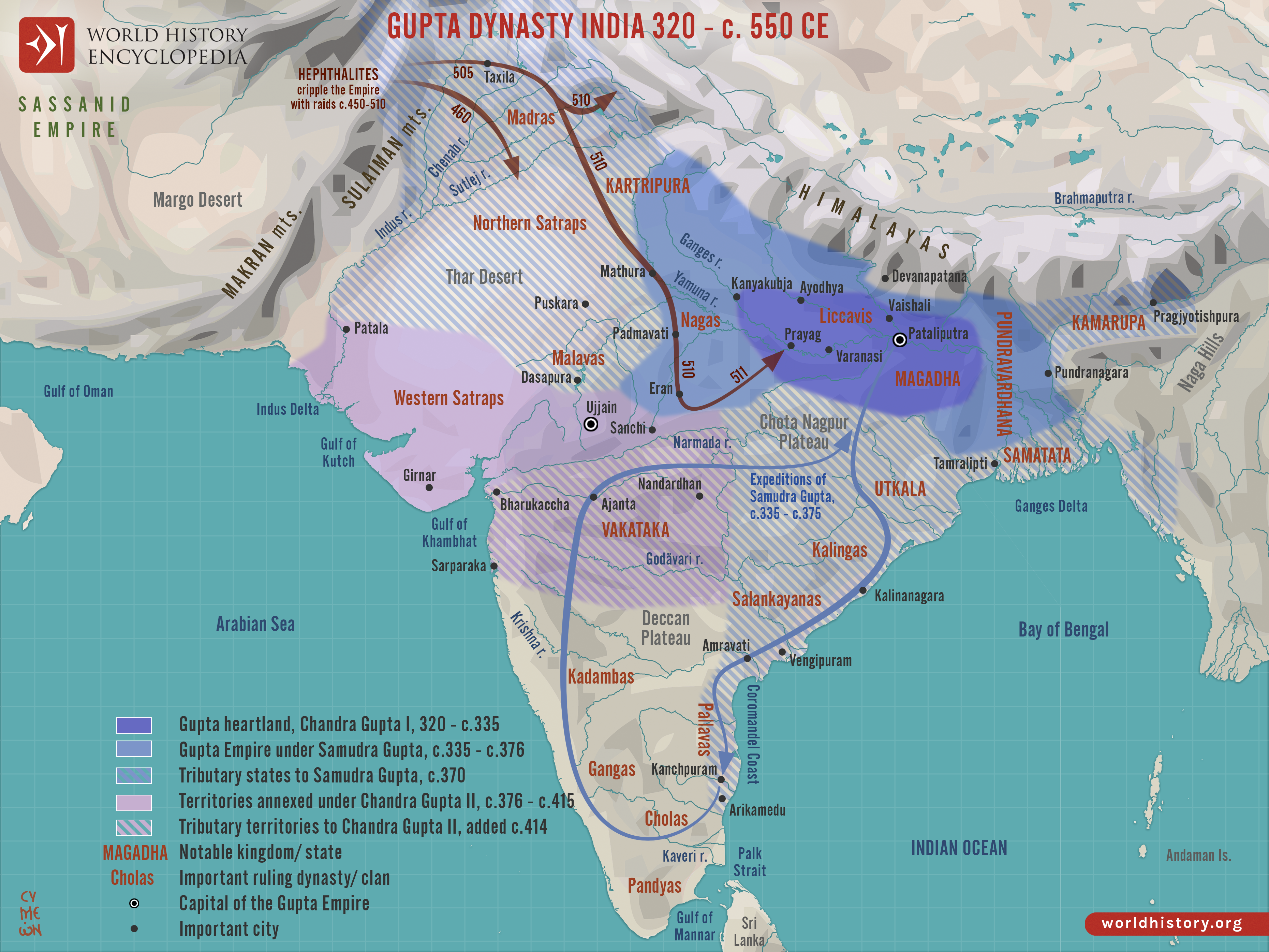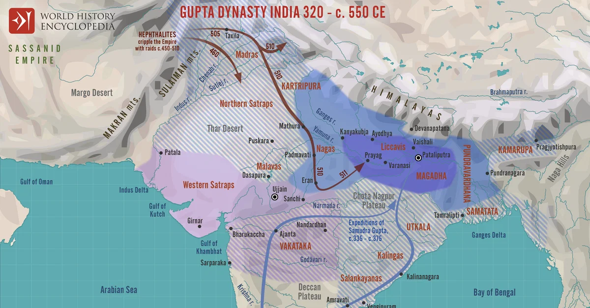 Netchev, S. (2021, November 26). Map of the Rise and Expansion of the Gupta Empire: From Magadha to Empire: Culture and Conquest in Classical India. World History Encyclopedia. https://www.worldhistory.org/image/14917/map-of-the-rise-and-expansion-of-the-gupta-empire/