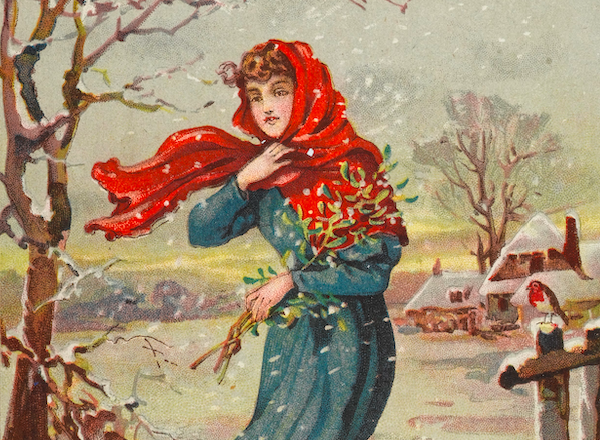 A detail of a 19th/early-20th century Christmas card showing a lady gathering mistletoe in the snow. (Welcome Collection Gallery)