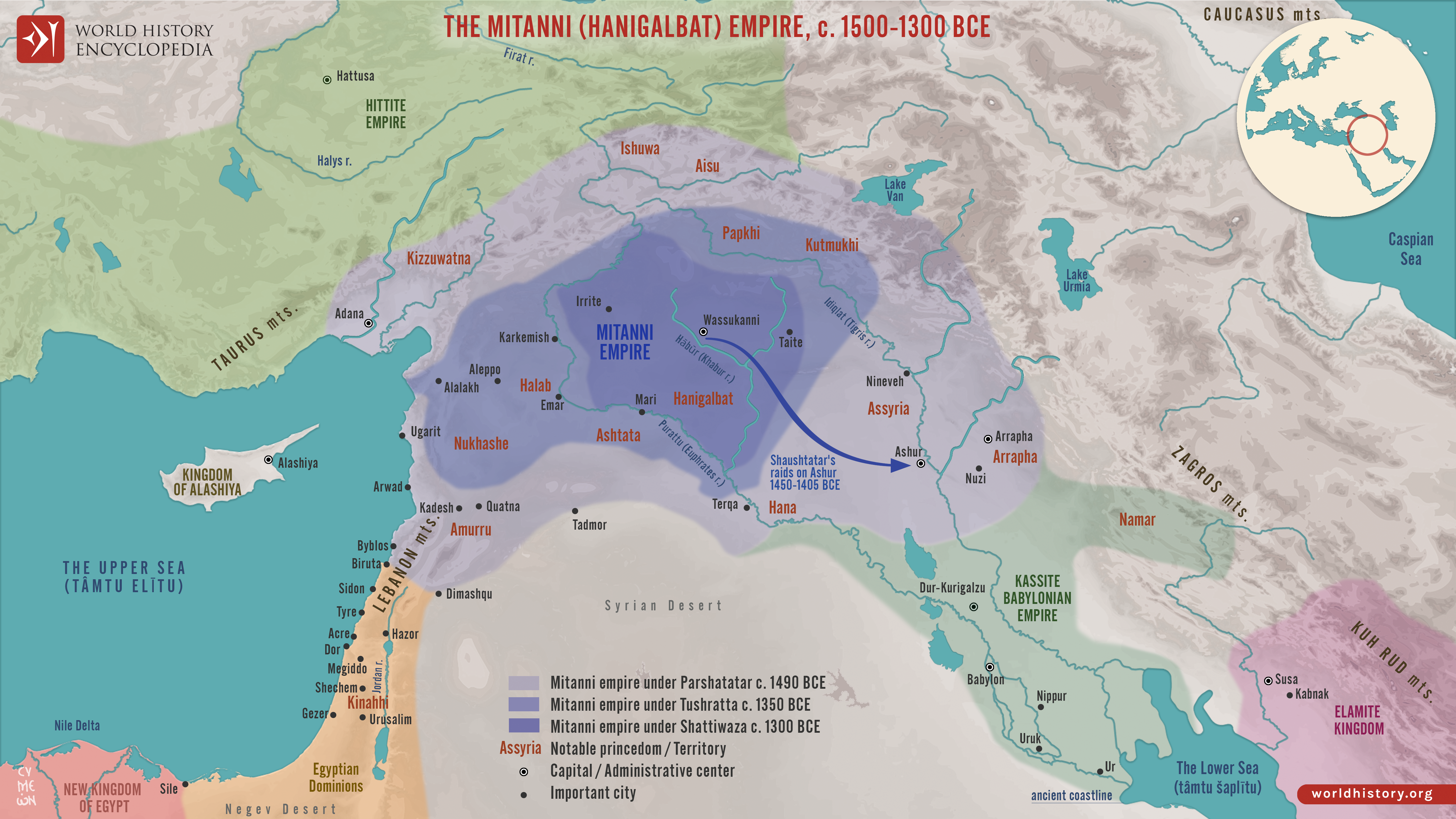 Netchev, S. (2026, January 15). Map of the The Mitanni (Hanigalbat) empire, c. 1600-1300 BCE: Between Egypt and the Hittites, A Kingdom of Diplomacy and War. World History Encyclopedia. https://www.worldhistory.org/image/14946/map-of-the-the-mitanni-hanigalbat-empire-c-1600-13/