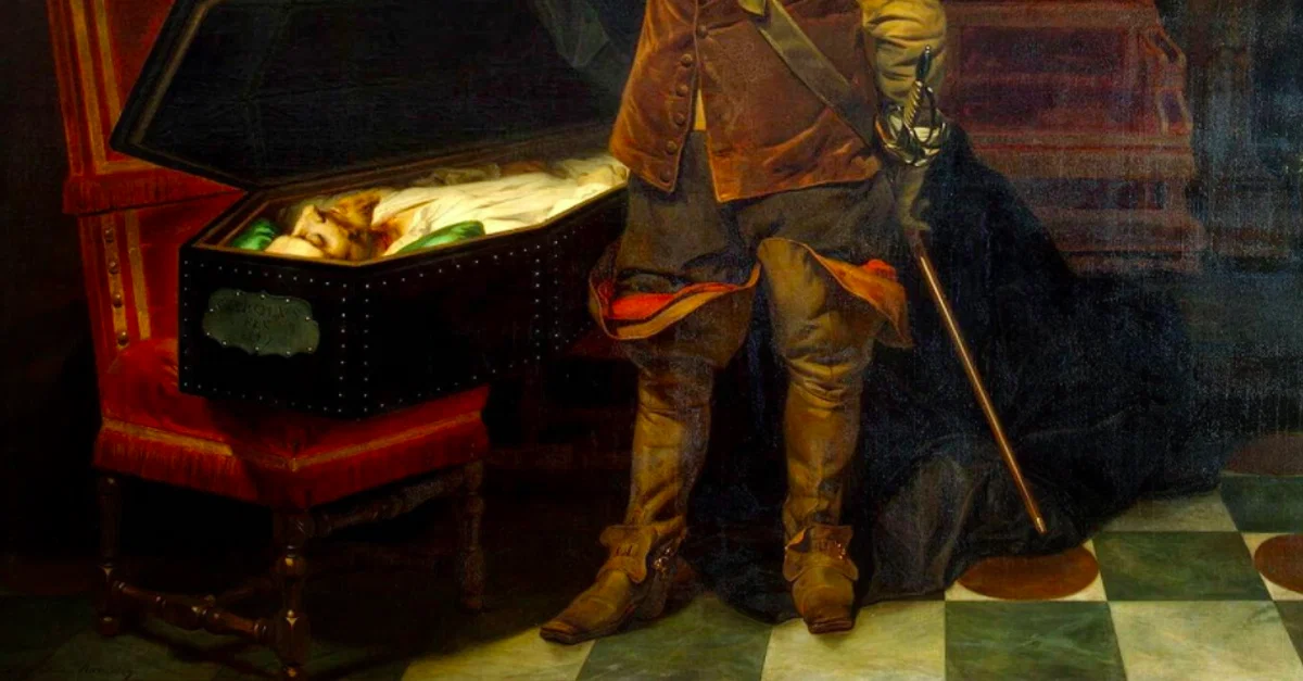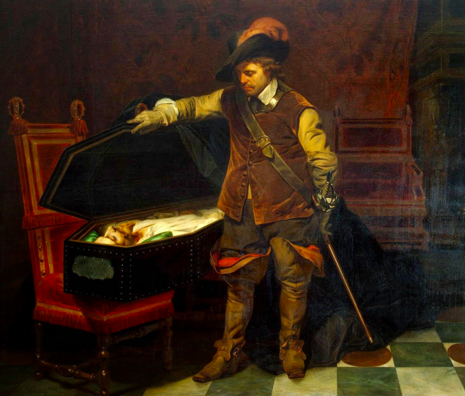 An 1831 painting by Paul Delaroche showing Oliver Cromwell (1599-1658) examining the dead body of King Charles I of England (r. 1625-1649) after the English Civil War (1642-51). (Hamburger Kunsthalle, Grmany)